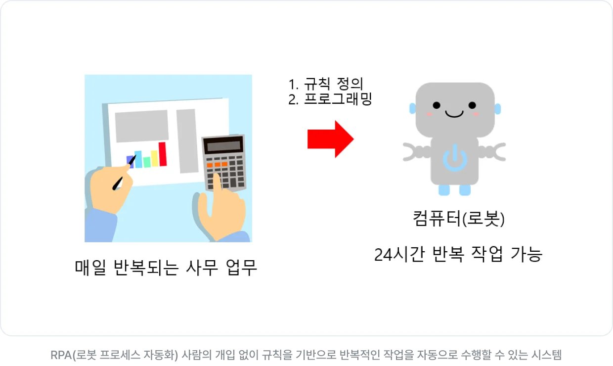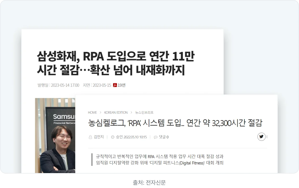 최근 RPA를 도입하여 업무 시간 효율화를 이뤘다는 대기업들의 사례를 많이 볼 수 있습니다. 대부분은 서류 분류, 데이터 가공 등 반복 업무를 자동화하는 과정에 RPA를 도입하고 있습니다. 반복되는 비효율적인 업무를 자동화하면서 기업들은 생산 비용 절감, 향상된 서비스 제공이 가능해졌고 이는 곧 기업의 경쟁력이 될 것입니다.