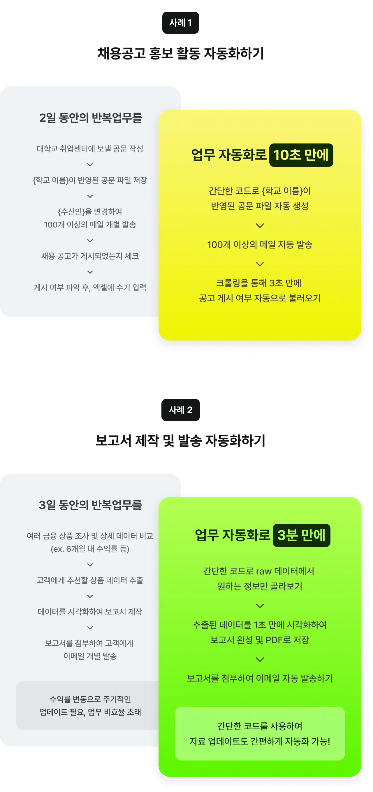 위 사례들은 비 개발 직군의 실무자가 메일 발송 자동화, 웹 크롤링, 데이터 분석 및 시각화 등의 업무 자동화 기술을 학습하고 실무에 적용한 결과물입니다. 즉, 몇 가지 기술만으로도 내 실무에 바로 적용하여 업무 자동화를 이룰 수 있다는 것입니다.