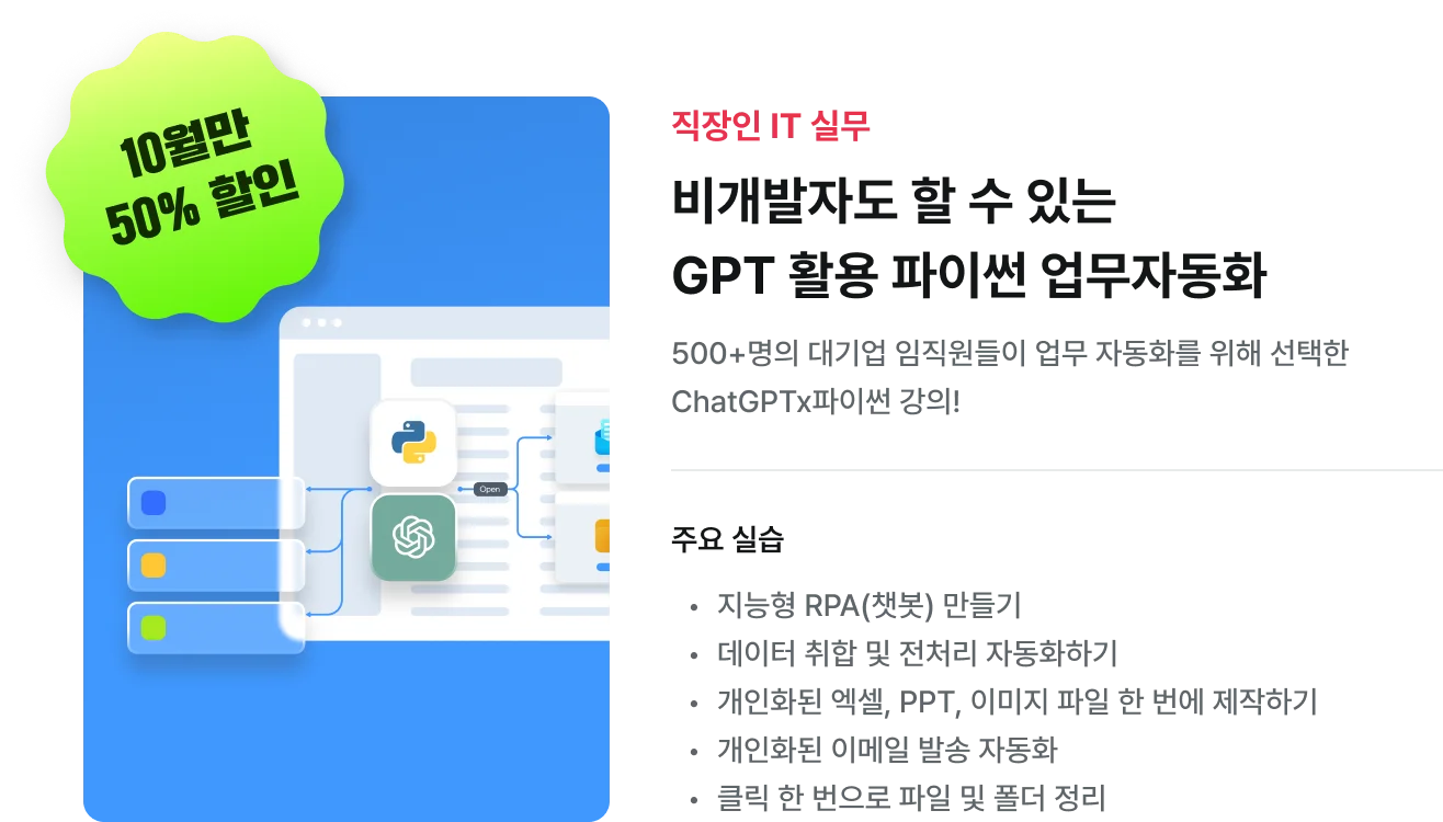 간단하지만 활용도 높은 업무 자동화 교육을 찾고 계신 분들께 아래 강의를 소개 드립니다. 약 500명 이상의 대기업 임직원들이 선택한 업무 자동화 강의를 온라인으로 새롭게 론칭하였습니다. 오늘 뉴스레터에 소개된 실습은 물론, 활용도 200%인 여러 실습들도 담겨있는 이번 업무 자동화 강의를 간편하게 만나보세요. 지금 신청하시면 50%할인 혜택도 제공해 드립니다!