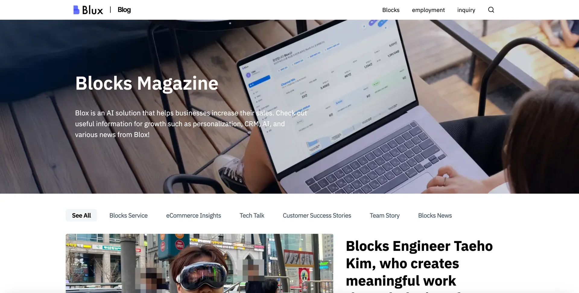 Blux's blog is an example of a website built on Inblog. It focuses on AI-driven marketing solutions designed to enhance corporate sales. The blog features insights from industry experts and showcases Blux’s innovative products, such as AI-powered personalized recommendations and hyper-personalized CRM marketing.