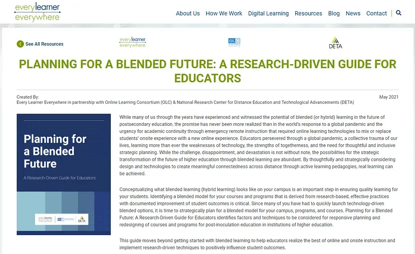 이에 DETA (The National Research Center for Distance Education and Technological Advancements; 미국 원격 교육 및 기술 발전 연구소), OLC (Online Learning Consortium; 온라인 학습 컨소시엄), Every Learner (Every Learner Everywhere; 에브리러너 에브리웨어)는 힘을 합쳐 블렌디드 러닝 가이드 북을 제작합니다.