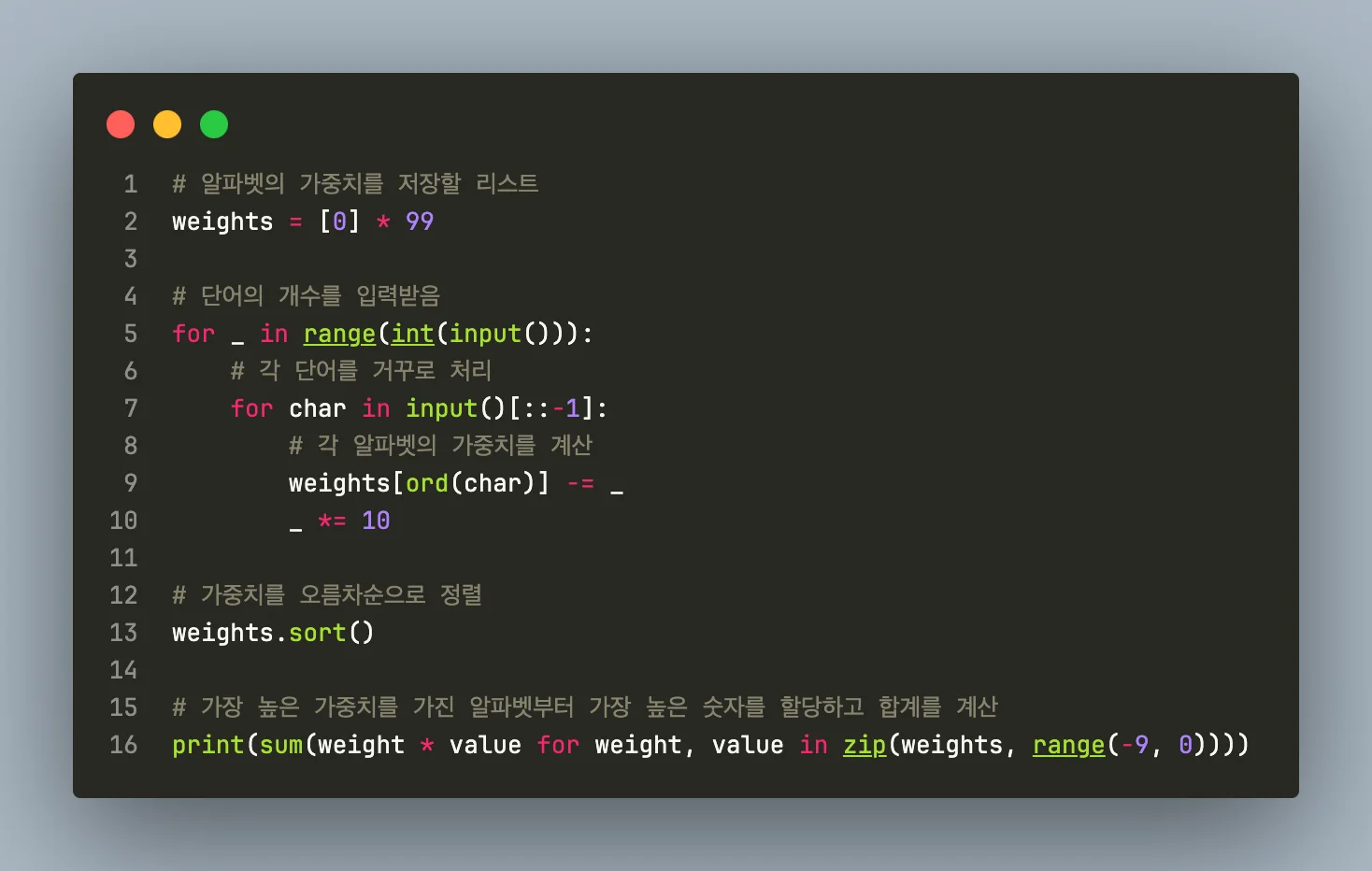 이 문제의 핵심은 단어의 알파벳별로 가중치를 계산하고, 가장 높은 가중치를 가진 알파벳부터 가장 높은 숫자를 할당하는 방식으로 문제를 해결하는 것이다. 이 방식을 사용하면 주어진 단어들의 합을 최대로 만들 수 있다.