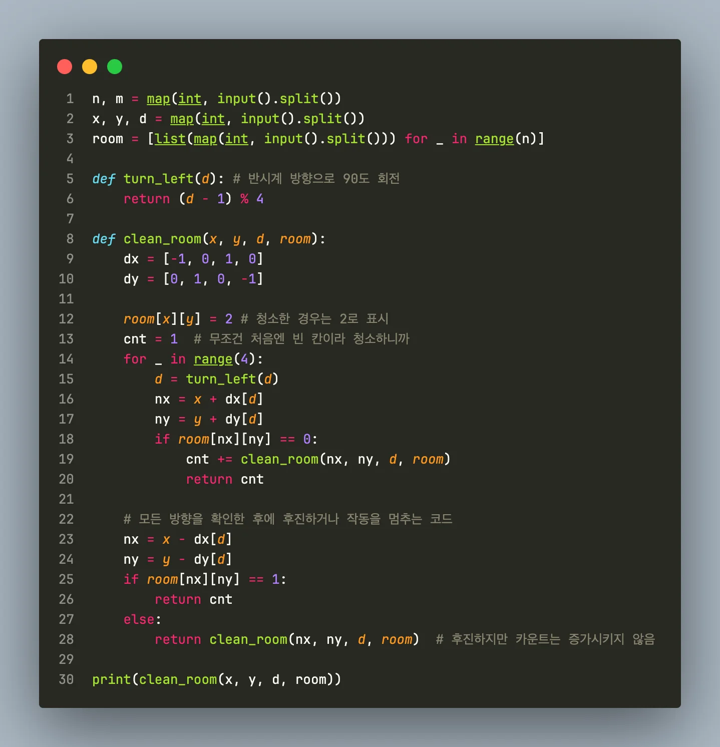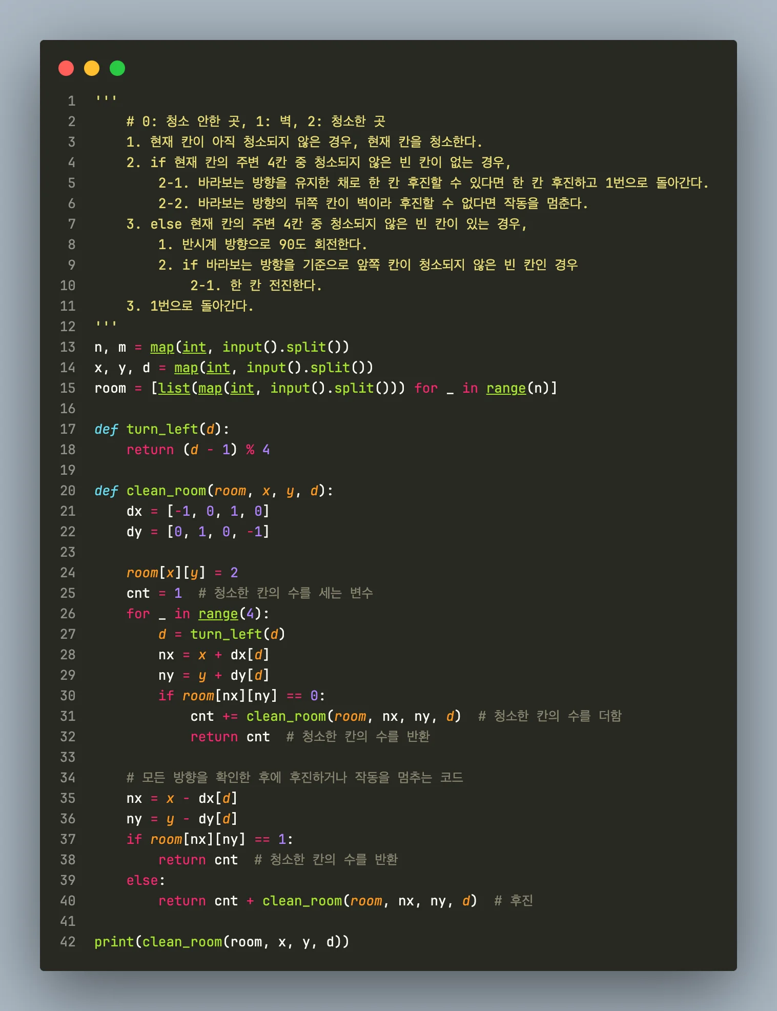 왼쪽으로 90도 방향을 바꾸기 위해 turn_left 함수를 만들고, 회전 후에는 로봇 청소기의 위치에 방향을 저장한다. 만약 0이면 카운트를 올리기 위해 clean_room을 재귀로 처리한다. 그리고 청소한 칸을 cnt를 반환한다.