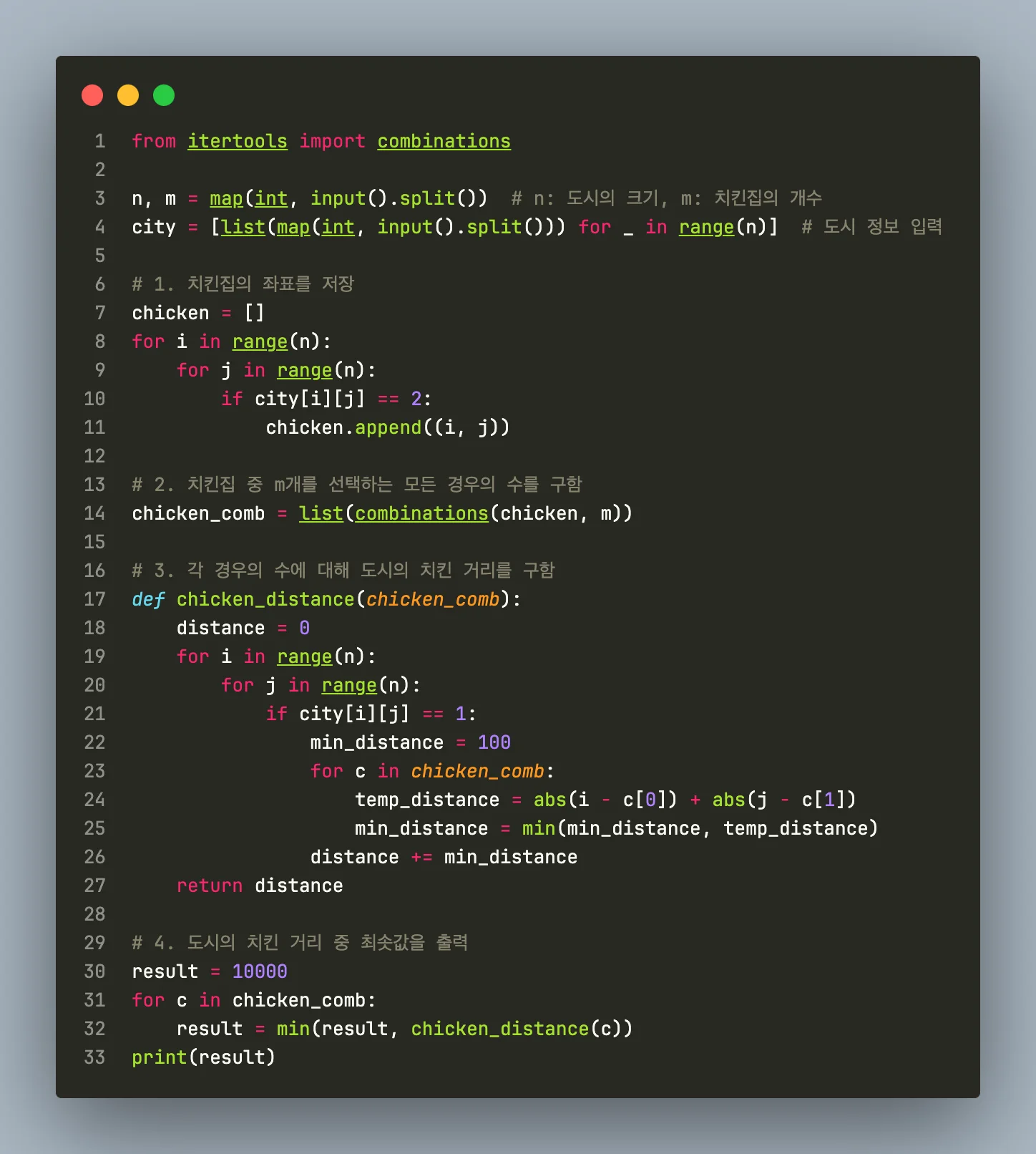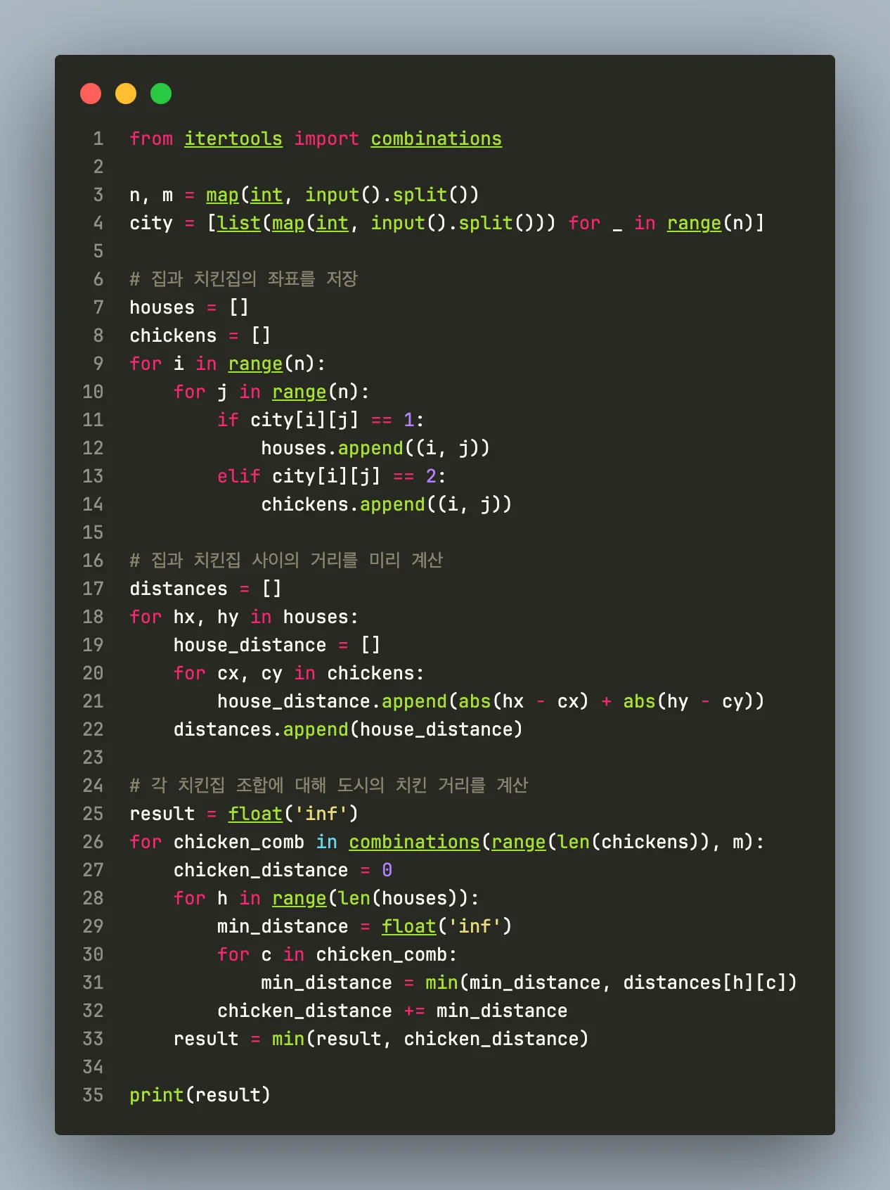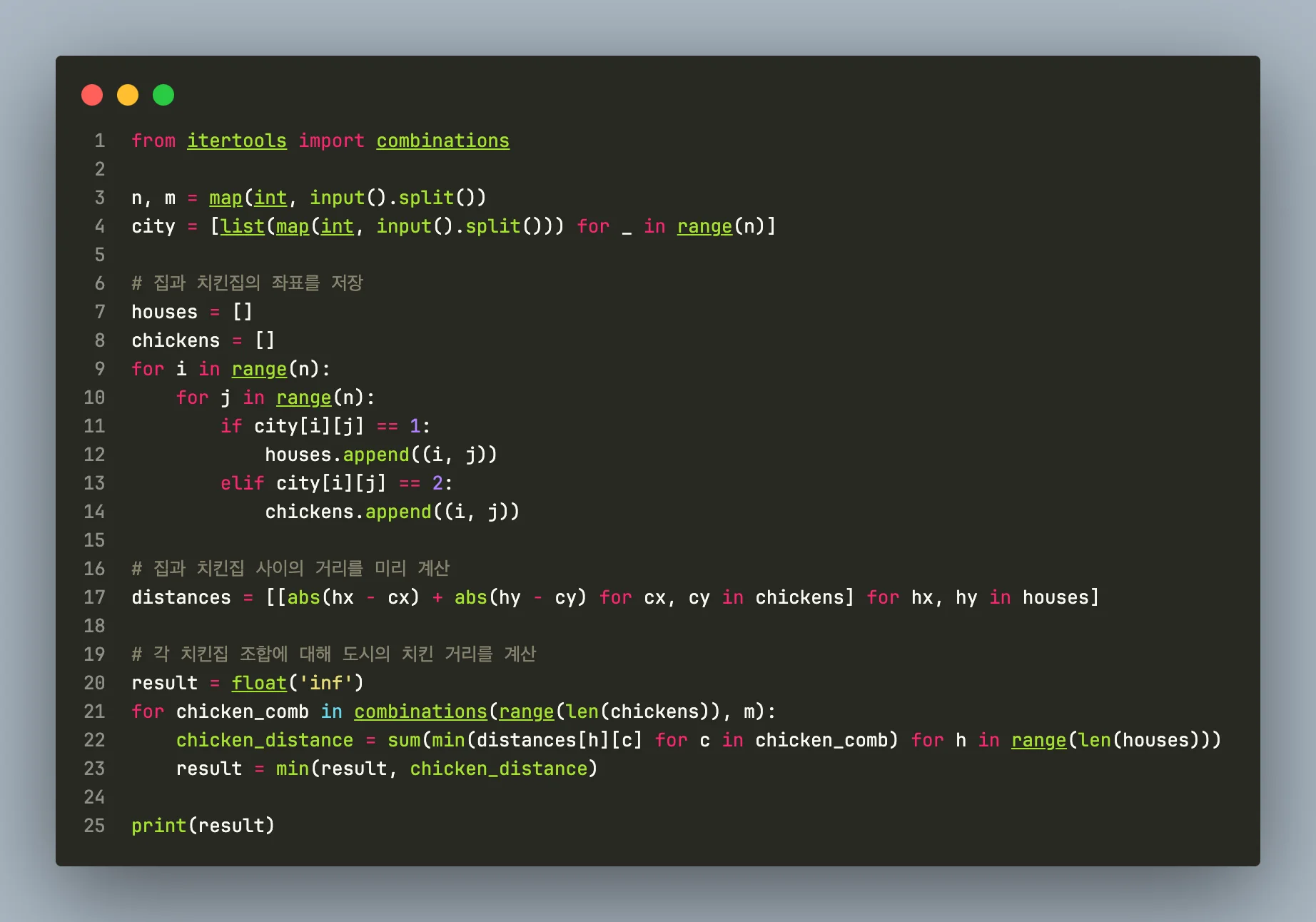 치킨집과 집의 좌표를 저장하는 건 쉽고, for문 중첩해서 거리 차이의 정보를 구하는 것도 어렵지 않다. 조합을 사용해서 m개의 치킨집을 고르는 부분이 막혀서 코파일럿의 도움을 받음… 실버 문제인가? 싶었는데 골드5 문제였다는….
