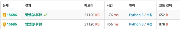 위 제출이 3차 풀이, 아래 제출이 2차 풀이인데 시간이 꽤 차이가 난다.