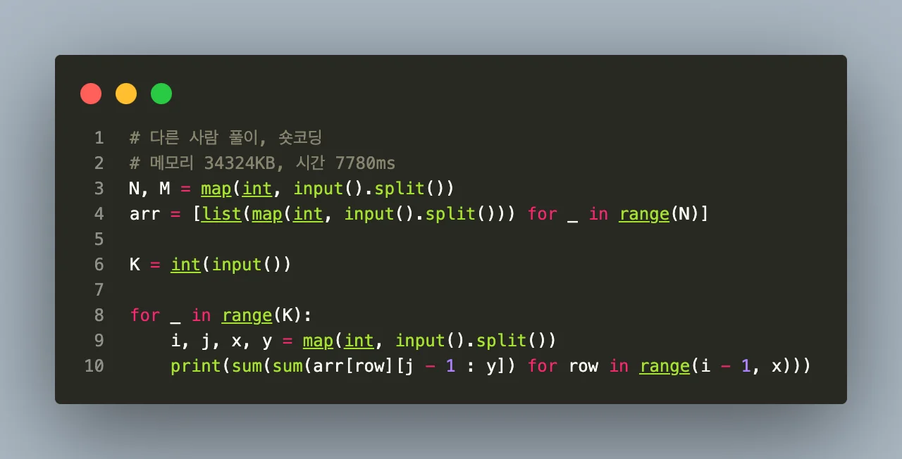그리고 sum(sum(arr[row][j-1:y]) for row in range(i-1, x))i행부터 x행까지 각 행의 합을 모두 더하여 범위 내의 총합을 계산하고 출력한다.