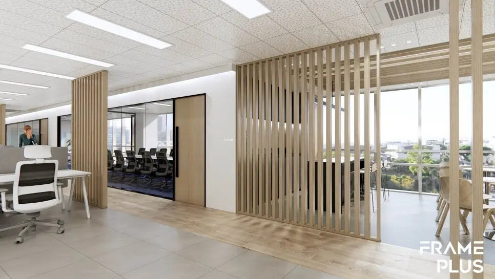 파티션 높이를 낮추고 일부 구역을 간살로 처리해 개방감을 극대화한 113평 대형 사무실 인테리어 솔루션! 입구·라운지·업무 공간·회의실·탕비실까지, 프레임플러스가 제안하는 효율적인 공간 활용법을 만나보세요.