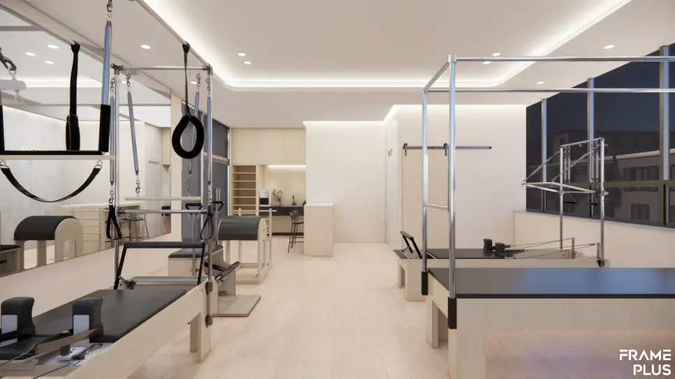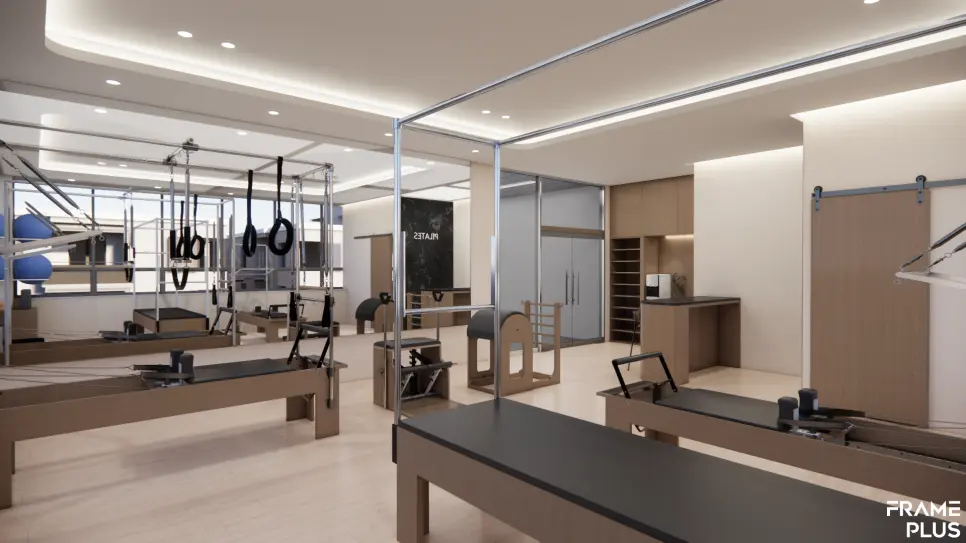 대리석, 유리, 고급 조명, 세련된 가구를 적절히 조합하면, 필라테스 아카데미 역시 기존의 헬스·피트니스 느낌을 탈피해 차별화된 분위기를 연출할 수 있습니다. 프레임플러스는 신축 상가 구조를 살리면서 견고하고 세련된 인테리어를 완성하고자 노력합니다.