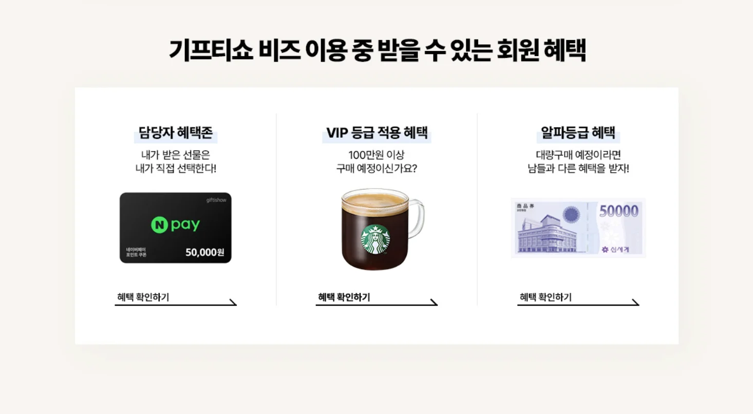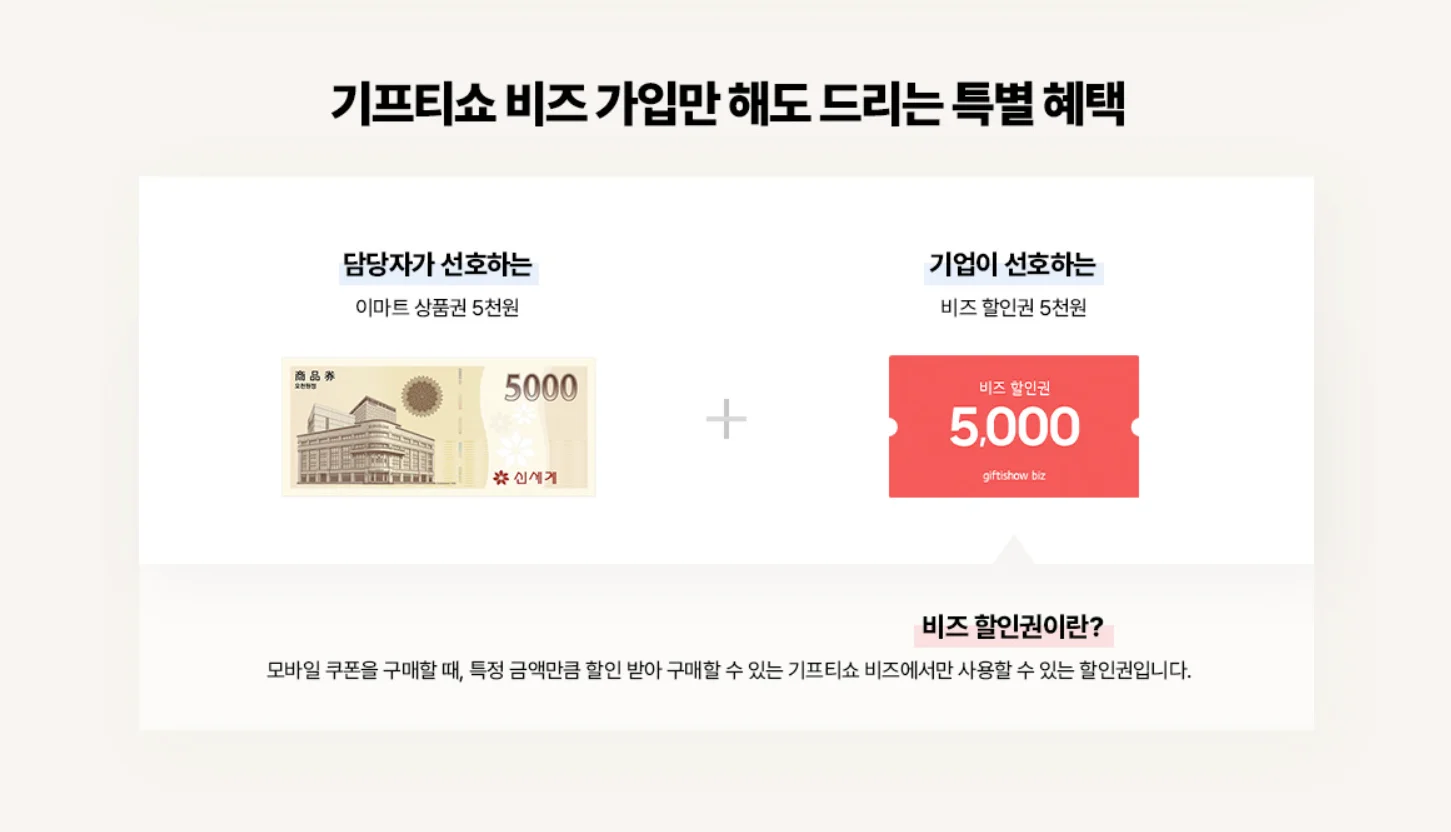 지금 바로 기프티쇼 비즈 회원가입을 통해 신규 가입 혜택도 받고, 새로운 서비스도 경험해보시기 바랍니다.