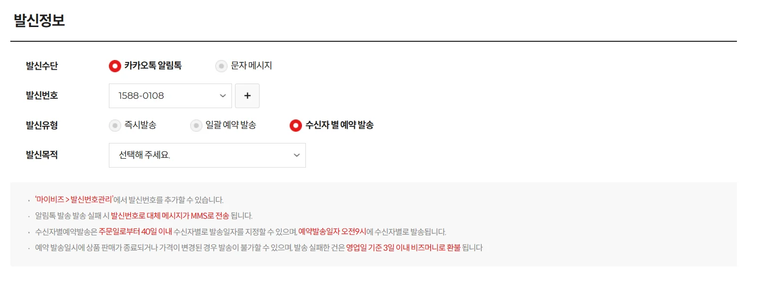 카카오톡 알림톡과 SMS 문자메시지 모두 예약 발송이 가능하며, 주문일로부터 30일 이내 09시부터 20시까지 30분 단위로 발송일시를 지정할 수 있답니다. 발송 일자는 물론 시간까지 디테일하게 지정이 가능하니, 모바일 쿠폰 발송을 해야하는 날 부득이하게 휴가를 사용할 때도 업무 공백 걱정 없이 다녀올 수 있어요.