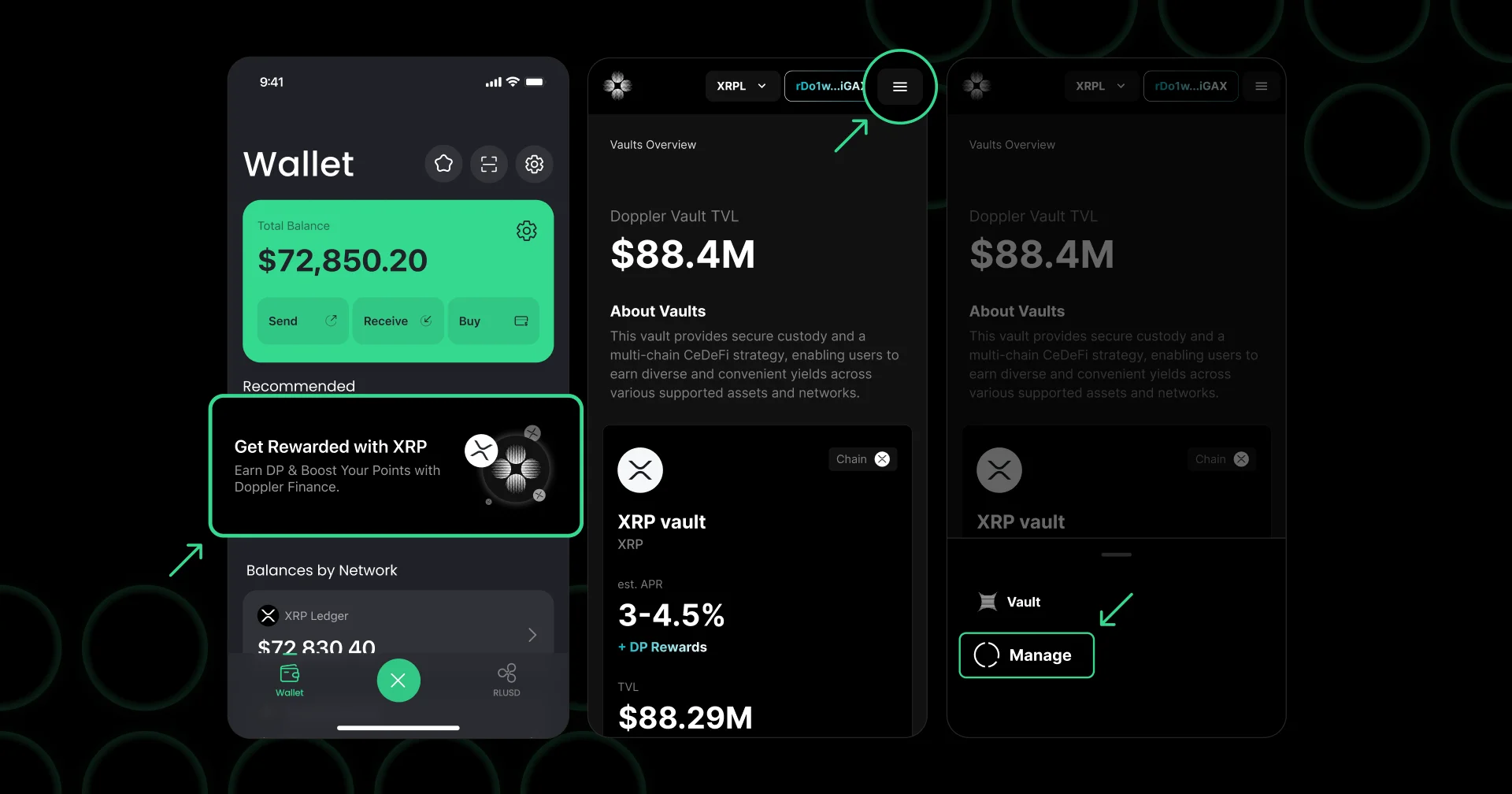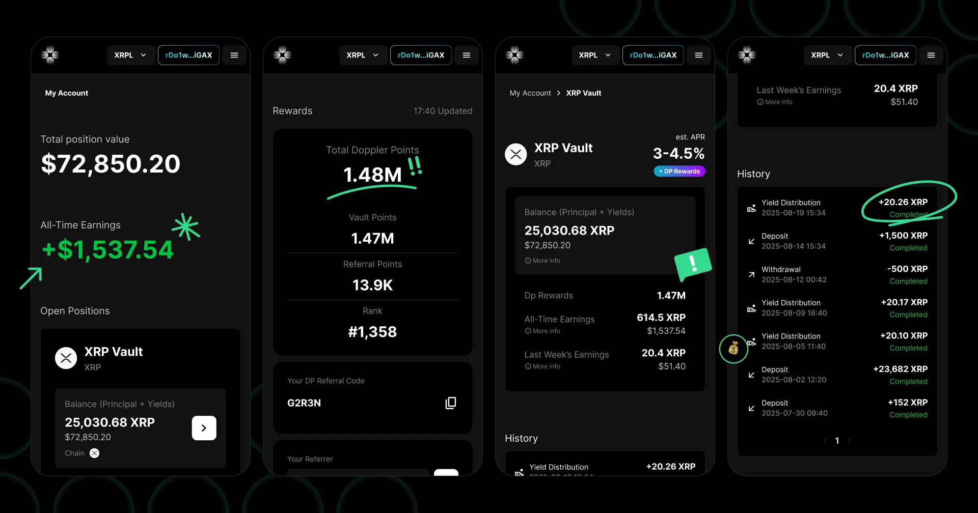 도플러 파이낸스(Doppler Finance)에 $XRP를 예치하면 자산에 기반해 보상(XRP)과 도플러 포인트(DP)가 적립됩니다. 예치된 자산과 보상은 도플러 파이낸스에서 제공하는 대시보드에서 확인할 수 있습니다.