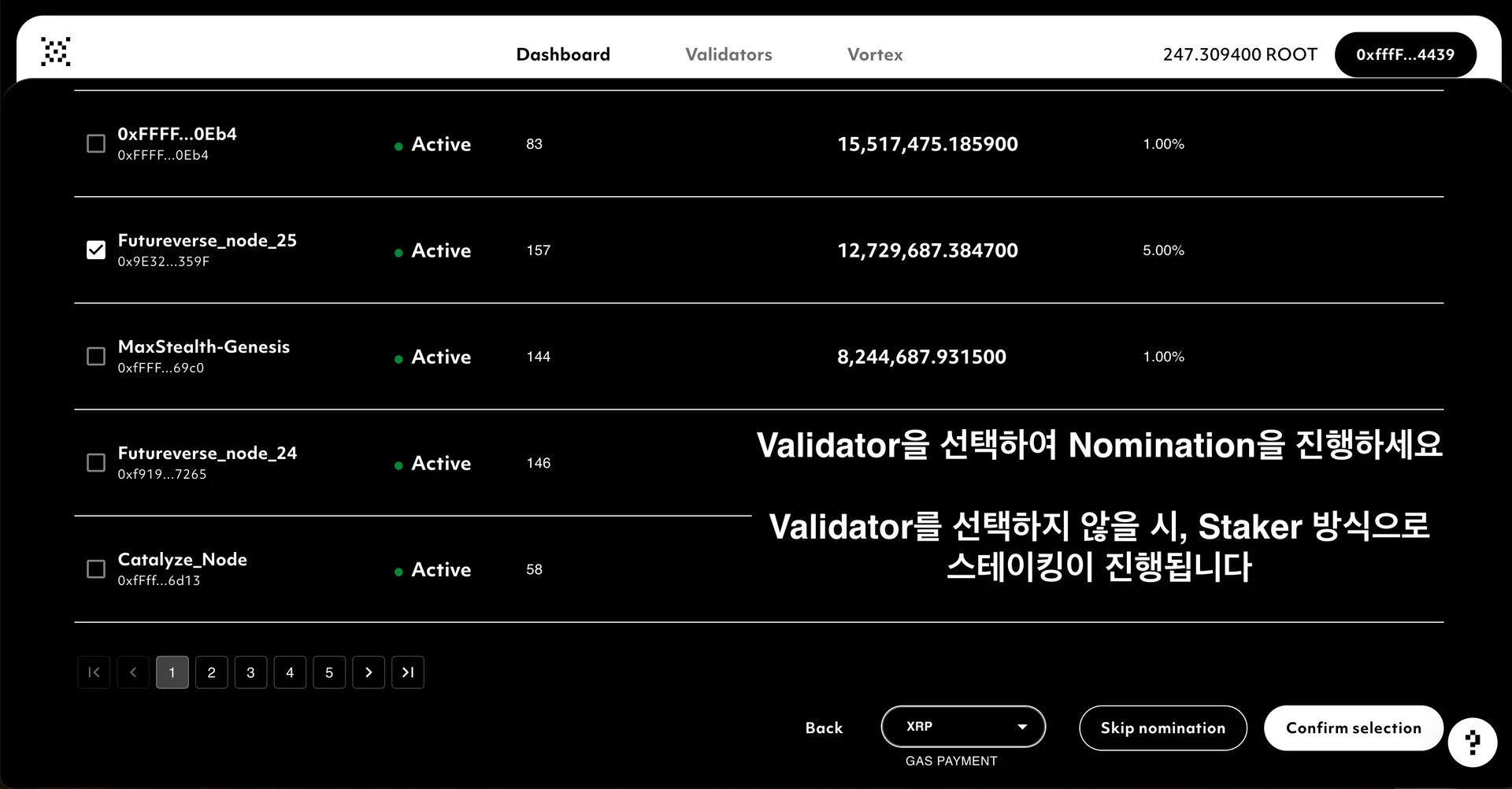 스테이킹한 ROOT는 지명한 Validator의 Slashing 위험에 노출될 수 있습니다. Nominator는 지속적으로 Validator 상태를 관리하고 모니터링해야 합니다.