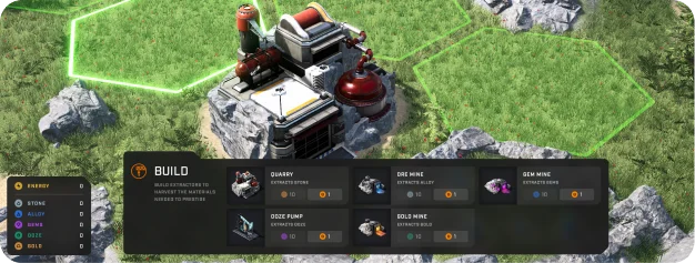 The five resources—Stone, Alloy, Gems, Ooze, and Gold—can be harvested and used to upgrade EXTRACTOR speed and capacity. Up to two EXTRACTORs can be built or upgraded simultaneously.