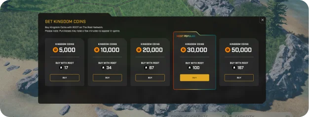 Kingdom Coin is a premium currency that speeds up game progression. Players can purchase up to 50,000 Kingdom Coins using $ROOT and spend them on upgrading Prysm and EXTRACTORs.