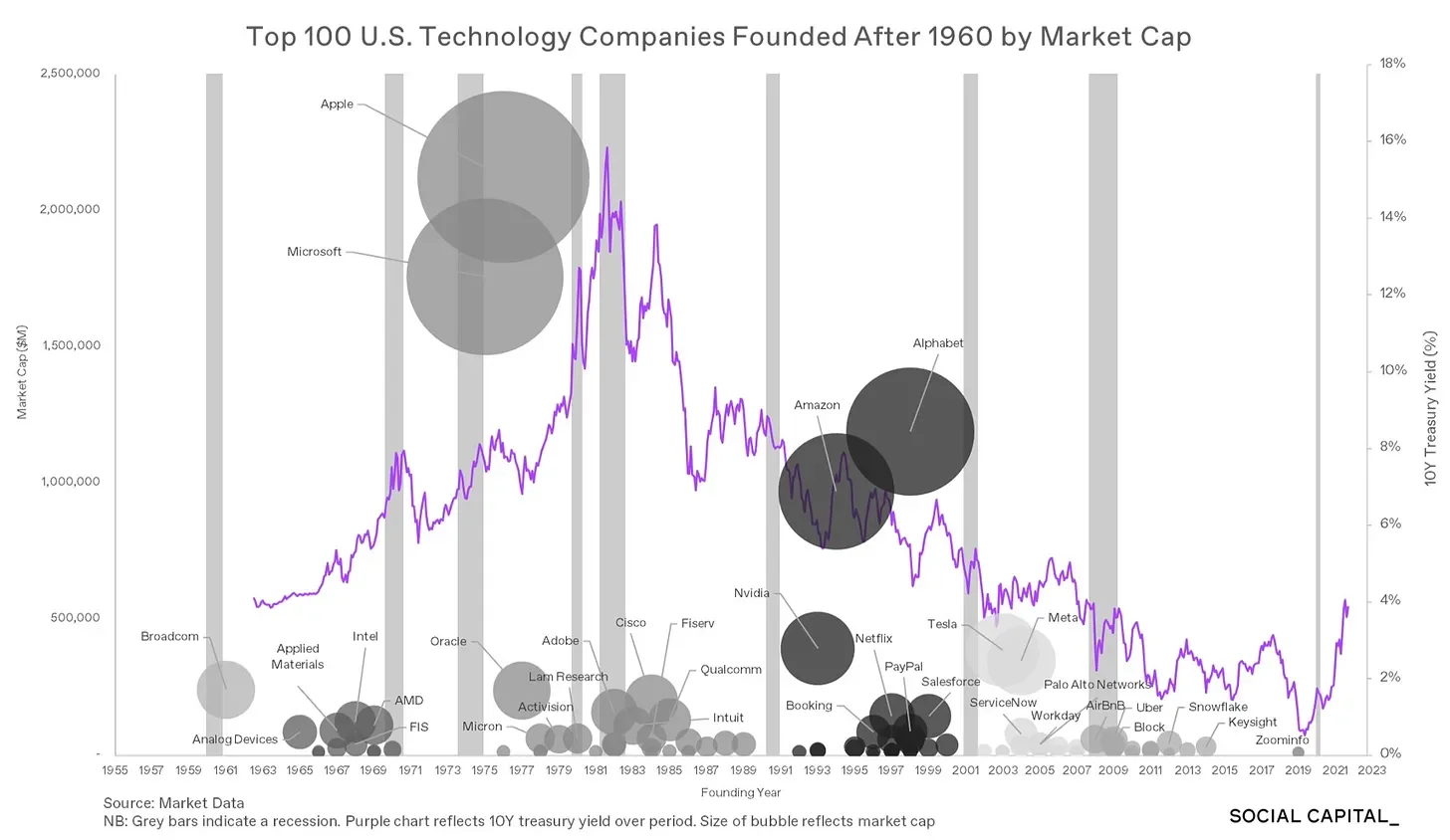 • 성공한 회사(애플, 마이크로소프트, 아마존, 구글 등)들은 고금리 환경에서 탄생하였음