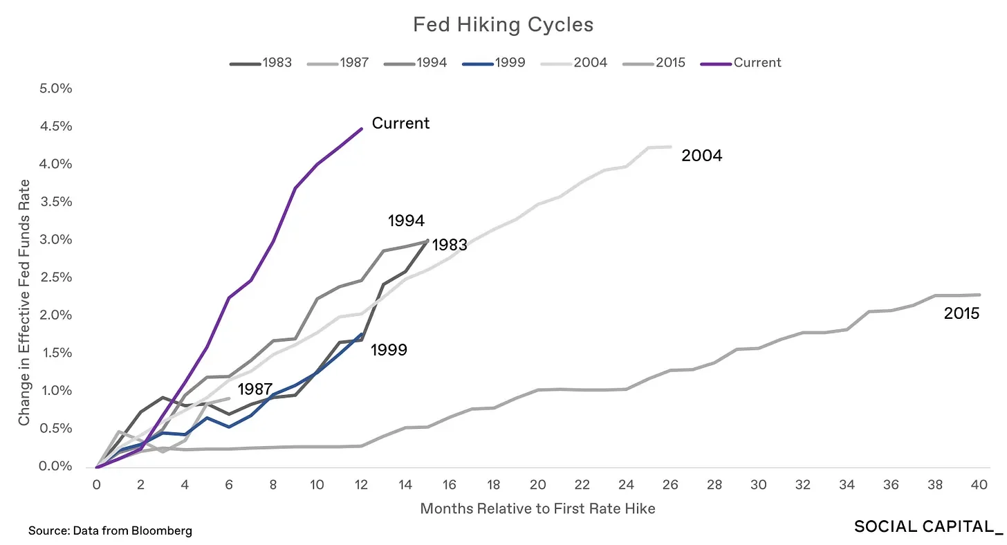 • 현재 미국 기준금리가 5.33%인데 역사적으로 보면 그렇게 높은 수준도 아니다. 문제는 금리인상 "속도"이다. 아직 이 급격한 금리인상에 대한 여파는 시장에 모두 반영되었다 보기 힘들다. 지금 많은 업체(스타트업, 대기업 포함) 힘든 시기를 보내고 있고, 아직 끝나지 않았다.