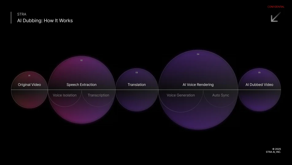 스트라 AI는 바로 이 콘텐츠 현지화 시장을 타겟팅합니다. 최신 음성 인식, LMM, TTS기술과 스트라가 자체 개발한 원본 배우의 숨소리까지 따라하는 보이스 컨버젼 기술을 결합하여 기존 더빙 과정을 혁신하는 서비스입니다. 또한 이 과정에서 프로덕션 품질을 달성하기 위해 가장 현지 시청자를 잘 이해하는 원어민 더빙 PD가 직접 번역 검수 및 QC를 수행하여 비용은 10배로 줄고, 속도는 10배로 빨라지고, 품질은 프로덕션 레벨을 자랑합니다.