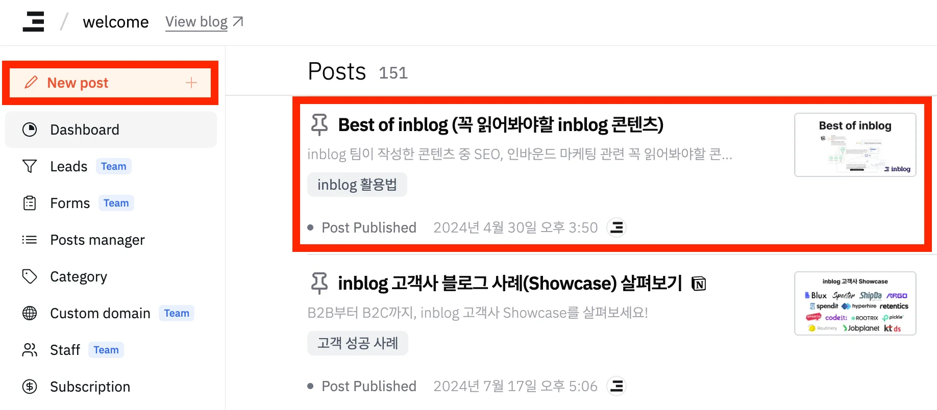Inblog 대시보드에서 원하는 게시물을 편집하기 위해 게시글 작성 버튼을 누르거나, 하단의 게시물을 클릭해 게시물 편집 페이지로 이동합니다.우측 설정 탭 활용: