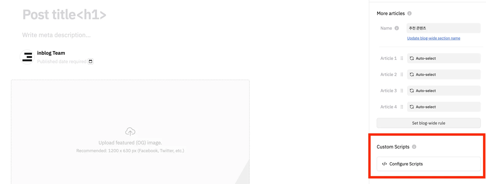 게시글 작성 화면 오른쪽에 위치한 ‘설정’ 탭을 클릭하면, 커스텀 스크립트를 삽입할 수 있는 옵션이 표시됩니다.커스텀 스크립트 모달: