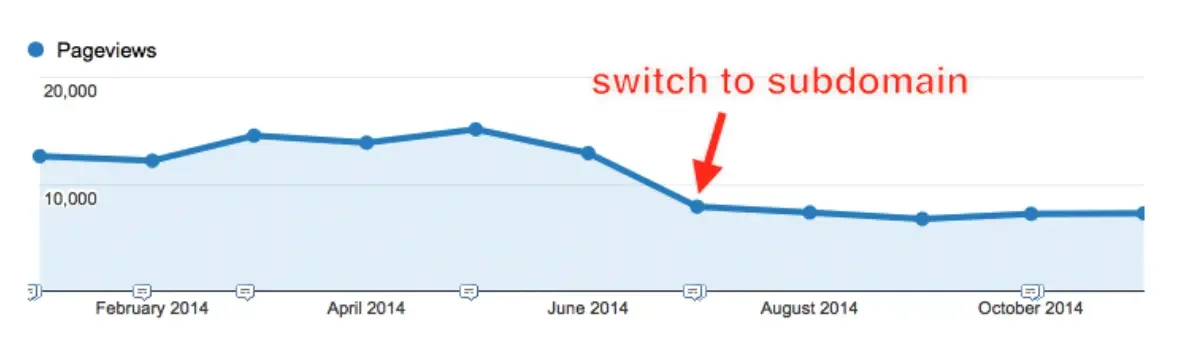 예를 들어, 도메인 등록 서비스인 아이원트마이네임(IWantMyName)은 블로그를 서브디렉토리에서 서브도메인으로 전환한 후 오가닉 트래픽이 급격히 감소했습니다.