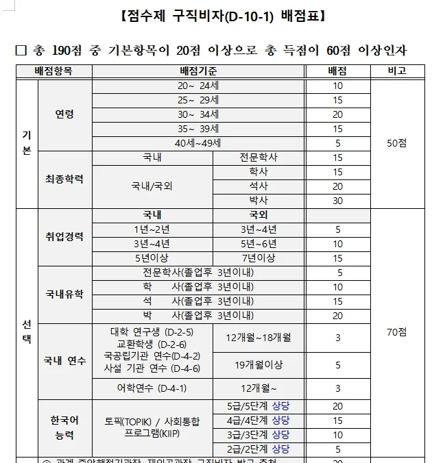 - 발급 대상: D-10-1비자는 점수제 비자로 점수표에서 60점 이상을 획득필수 (점수표에는 국내 학위증 보유여부, 한국어 능력 시험 점수 등으로 당락 결정)