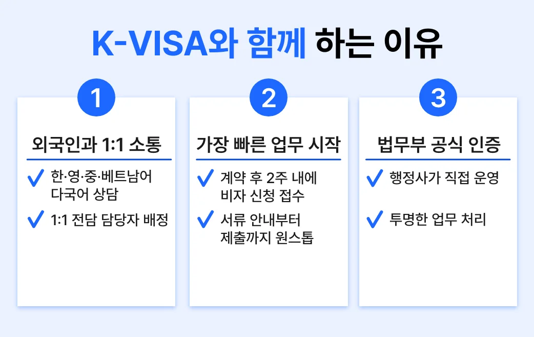 🗨️ "인재 발굴에만 집중하세요. 까다로운 서류와 출입국 행정은 케이비자가 전담합니다."