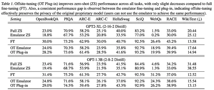 위 테이블은 자연어 모델인 ‘GPT2’와 ‘OPT’에 Offsite-tuning을 적용하였을 때의 성능 비교입니다. 여기서 주목할 부분은 Full ZS, FT, 그리고 OT Plug-in 입니다.