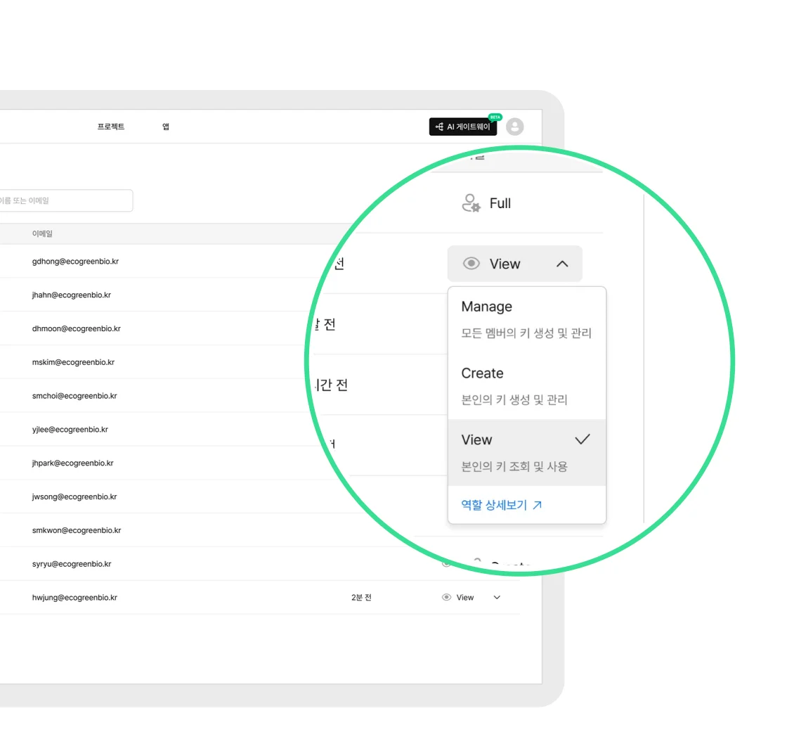 AI 게이트웨이는 권한 관리 기능을 통해 이러한 문제를 예방합니다. 관리자는 특정 역할에 따라 권한을 세분화하고, 팀별로 적절한 접근 권한을 부여할 수 있습니다. 또한, API Key의 발급과 삭제, 권한 위임도 체계적으로 관리할 수 있어 책임 추적이 용이합니다.