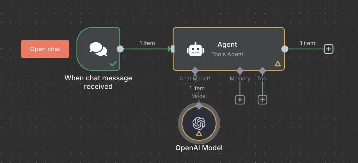 n8n 워크플로우에서 LLM을 사용하고 싶은 위치에 OpenAI 노드를 추가합니다.