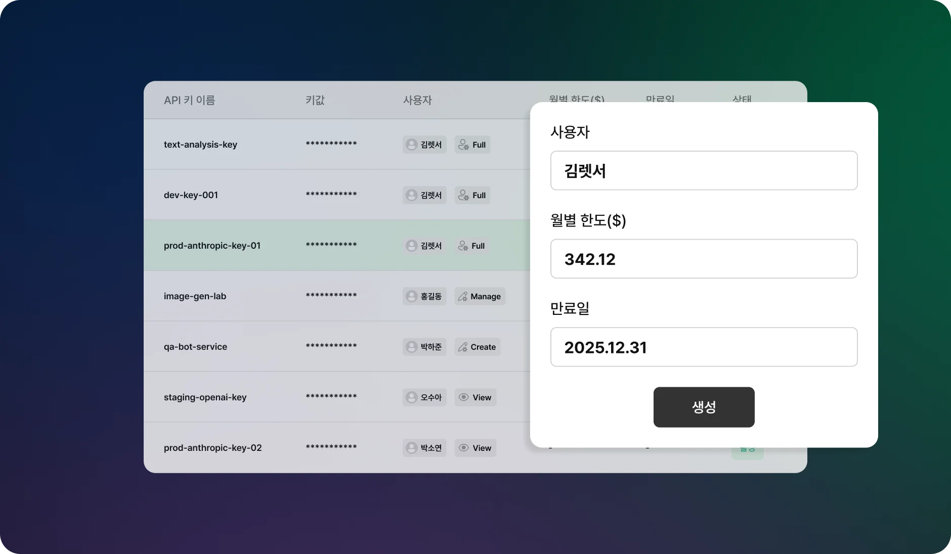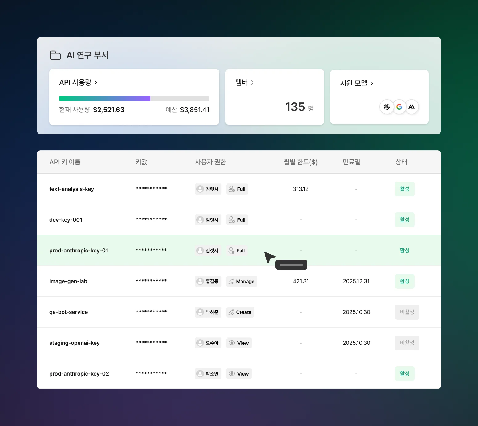 Centralized API Key Management – 사용자·팀·조직 단위의 키 발급/만료/권한 제어로 보안 거버넌스 강화