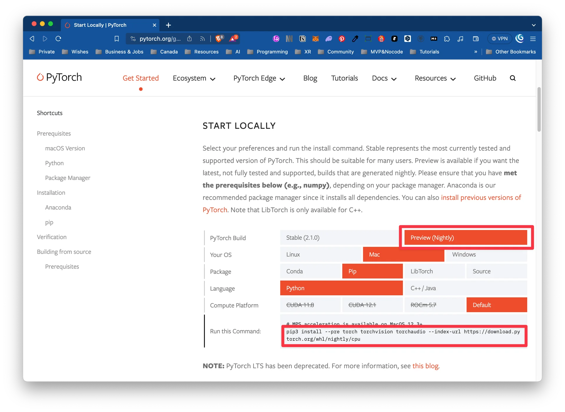 최신 맥에서 Metal Graphic을 지원받을 수 있는 Nightly 버젼으로 Pytorch를 설치 합니다. https://pytorch.org/get-started/locally/ 에서 아래 이미지와 같이 Stable버전이 아닌 Nightly버전 선택 후에 명령어를 복사합니다.