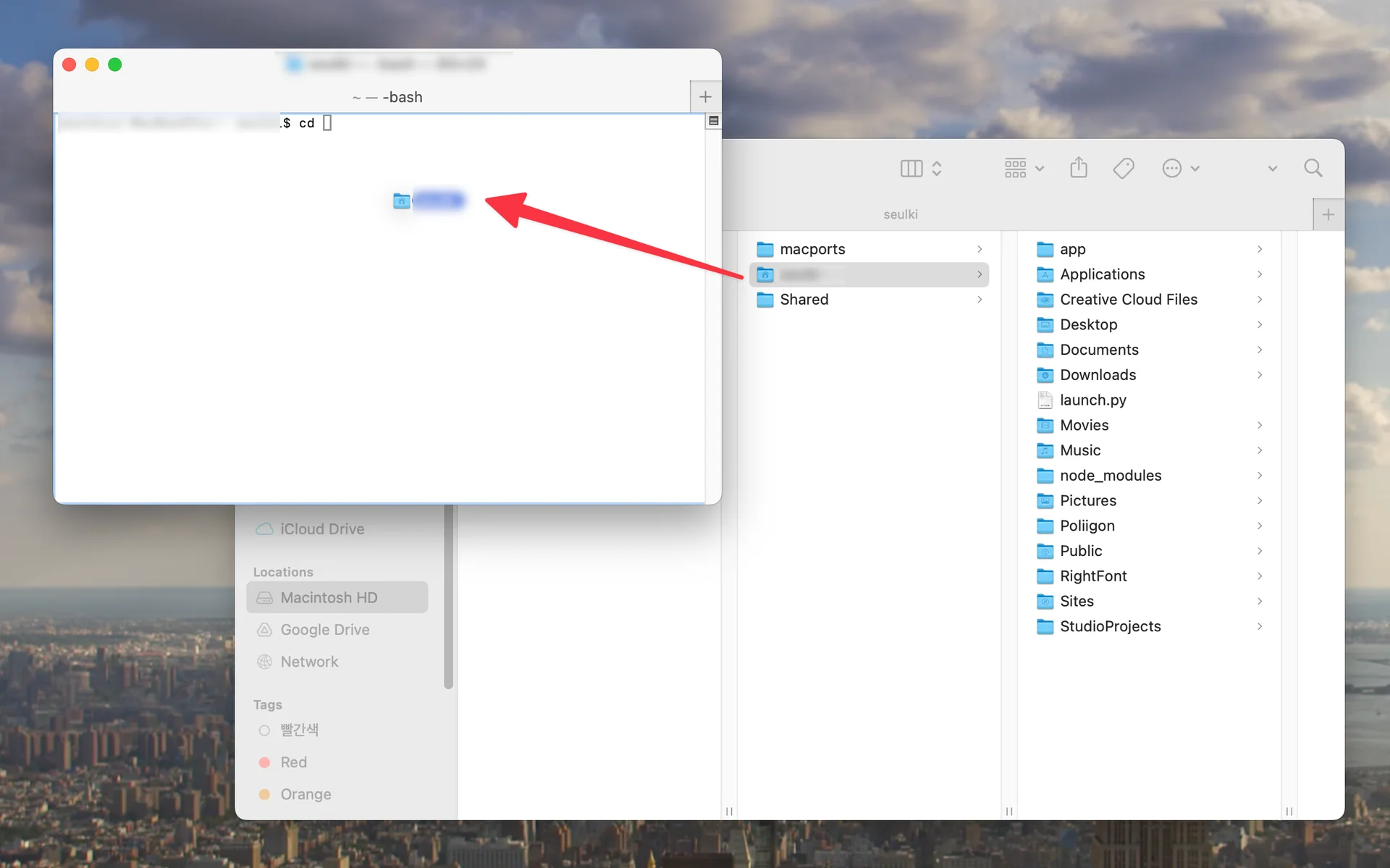 터미널에서 방금 생성한 폴더 주소를 입력한다. 주소를 모를 경우