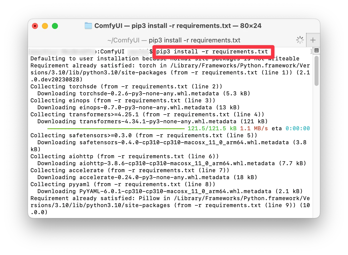pip3 install -r requirements.txt를 입력하고 실행해서 ComfyUI에 필요한 요소들을 설치합니다.