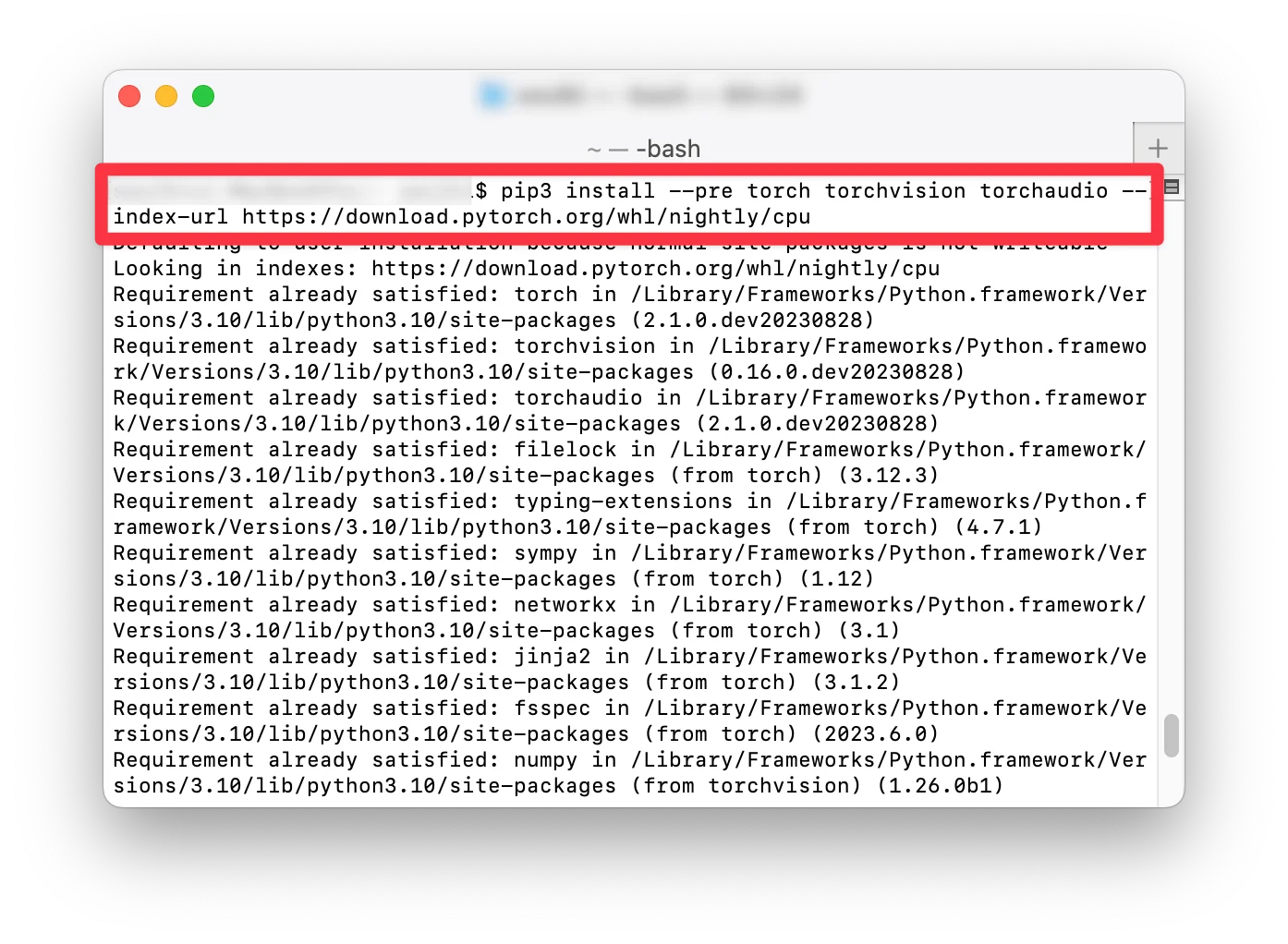 pip3 install --pre torch torchvision torchaudio --index-url https://download.pytorch.org/whl/nightly/cpu터미널에 복사한 명령어를 붙여넣기 하고 실행시킵니다.
