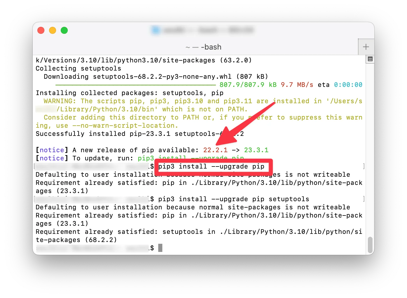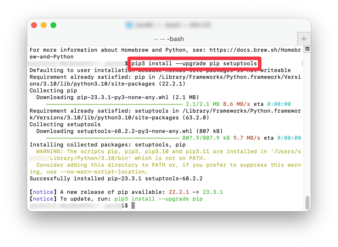 pip3 install --upgrade pip setuptools을 입력 후 최신의 설치 패키지를 업그레이드 합니다.만약 아래와 같이 새로운 버전에 pip 설치를 업데이트하라고 하면