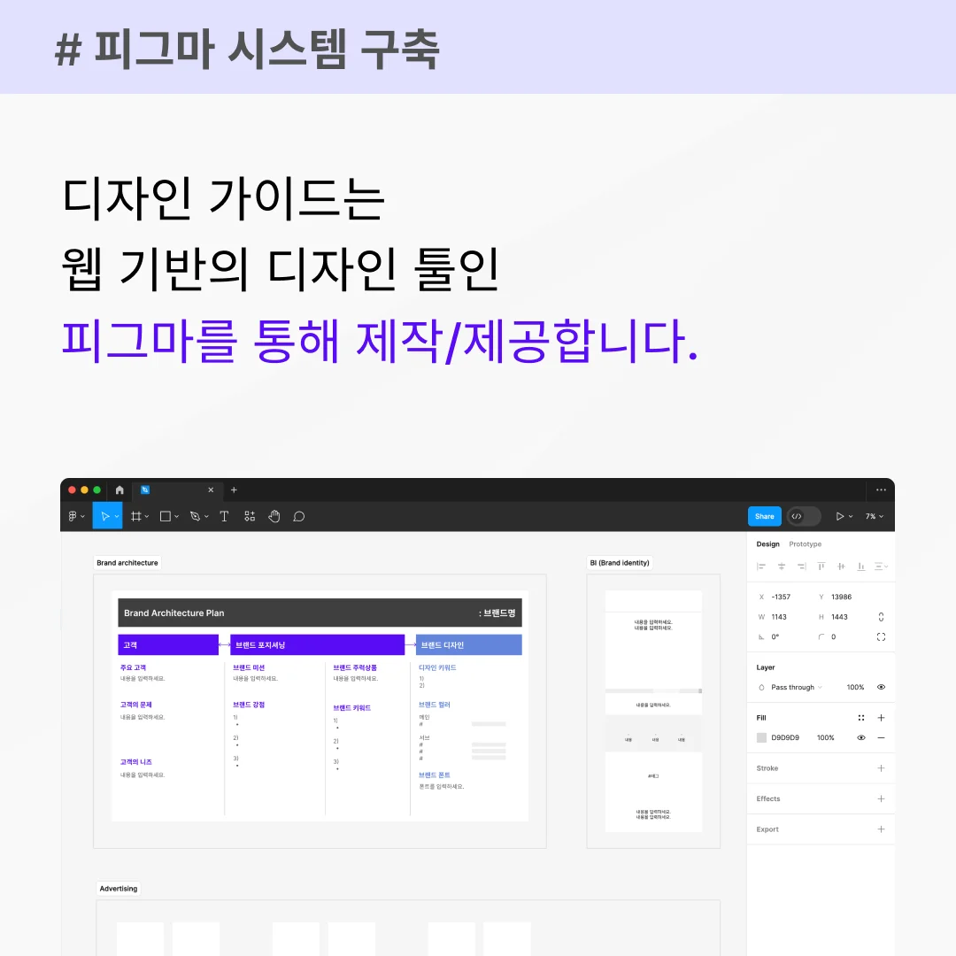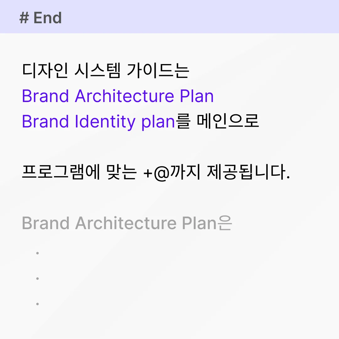 디자인 시스템 가이드는 Brand Architecture Plan, Brand Identity plan를 메인으로 프로그램에 맞는 +@까지 제공됩니다.