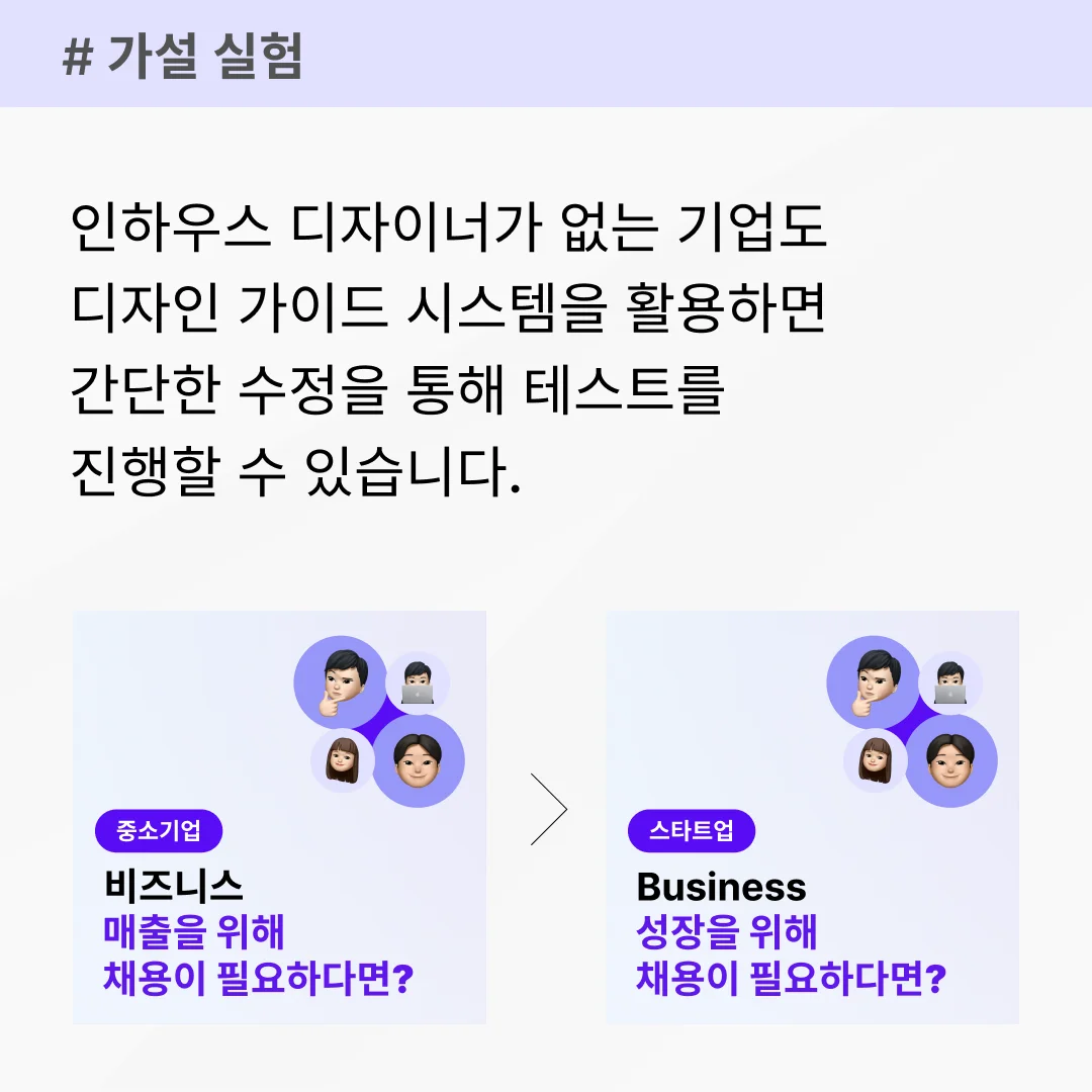 인하우스 디자이너가 없는 기업도 디자인 가이드 시스템을 활용하면 간단한 수정을 통해 테스트를 진행할 수 있습니다.