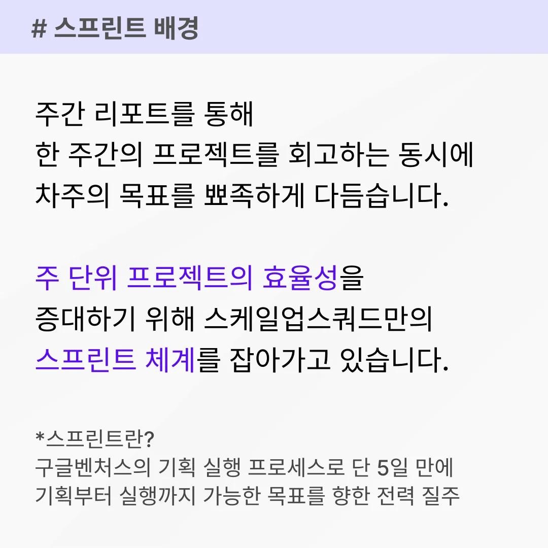 주 단위로 진행되는 프로젝트의 효율성을 증대하기 위해 스케일업스쿼드만의 스프린트 체계를 잡아가고 있습니다.