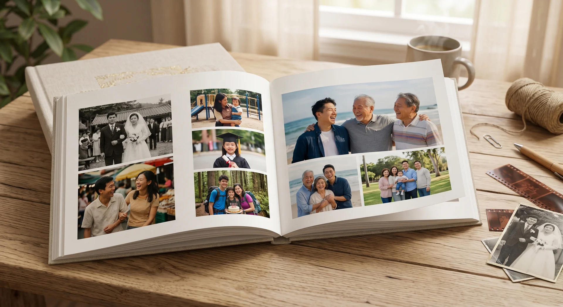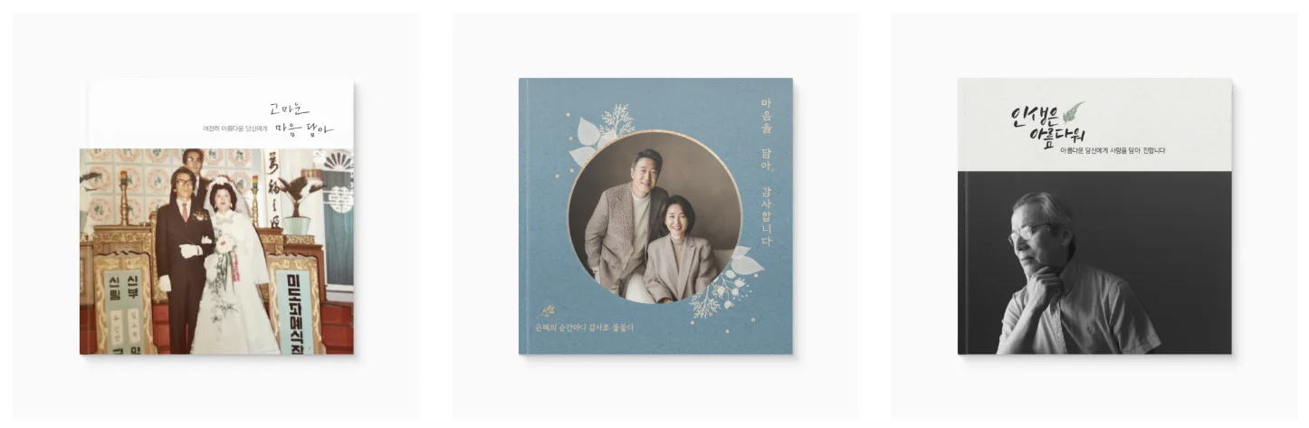첫째, 세상에 하나뿐인 선물입니다. 우리 가족 사진으로만 만들기 때문에 어디서도 살 수 없어요. 둘째, 시간이 담겨 있어요. 아이 때 사진부터 최근 가족사진까지 시간의 흐름이 고스란히 담겨 감동이 두 배입니다. 셋째, 보관이 쉬워요. 스마트폰 속 사진은 보기 어렵지만, 포토북은 언제든 손쉽게 꺼내볼 수 있죠.