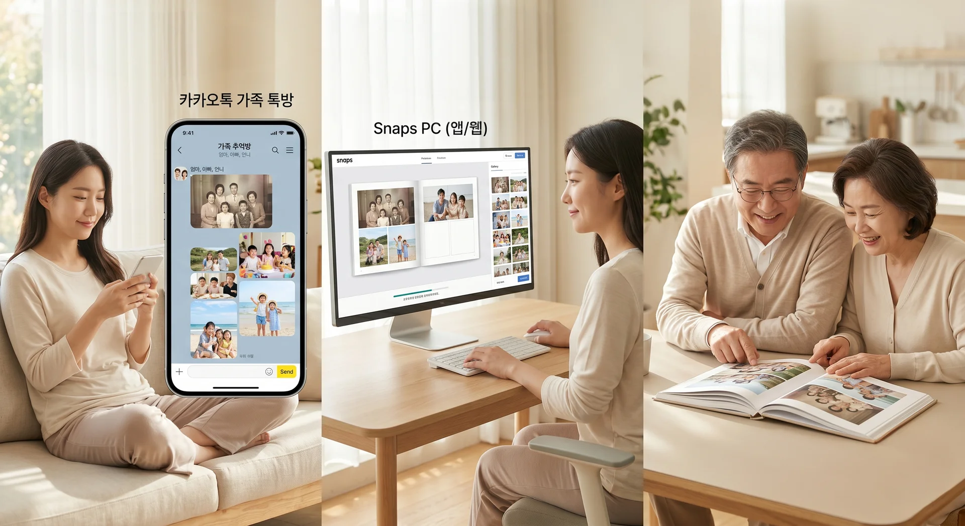 STEP 1 — 사진 모으기: 가족 단톡방에 "어버이날 포토북 만들게요, 사진 올려주세요" 한 마디면 끝이에요. 카카오톡 사진, 오래된 앨범 스캔본, 모두 OK입니다.