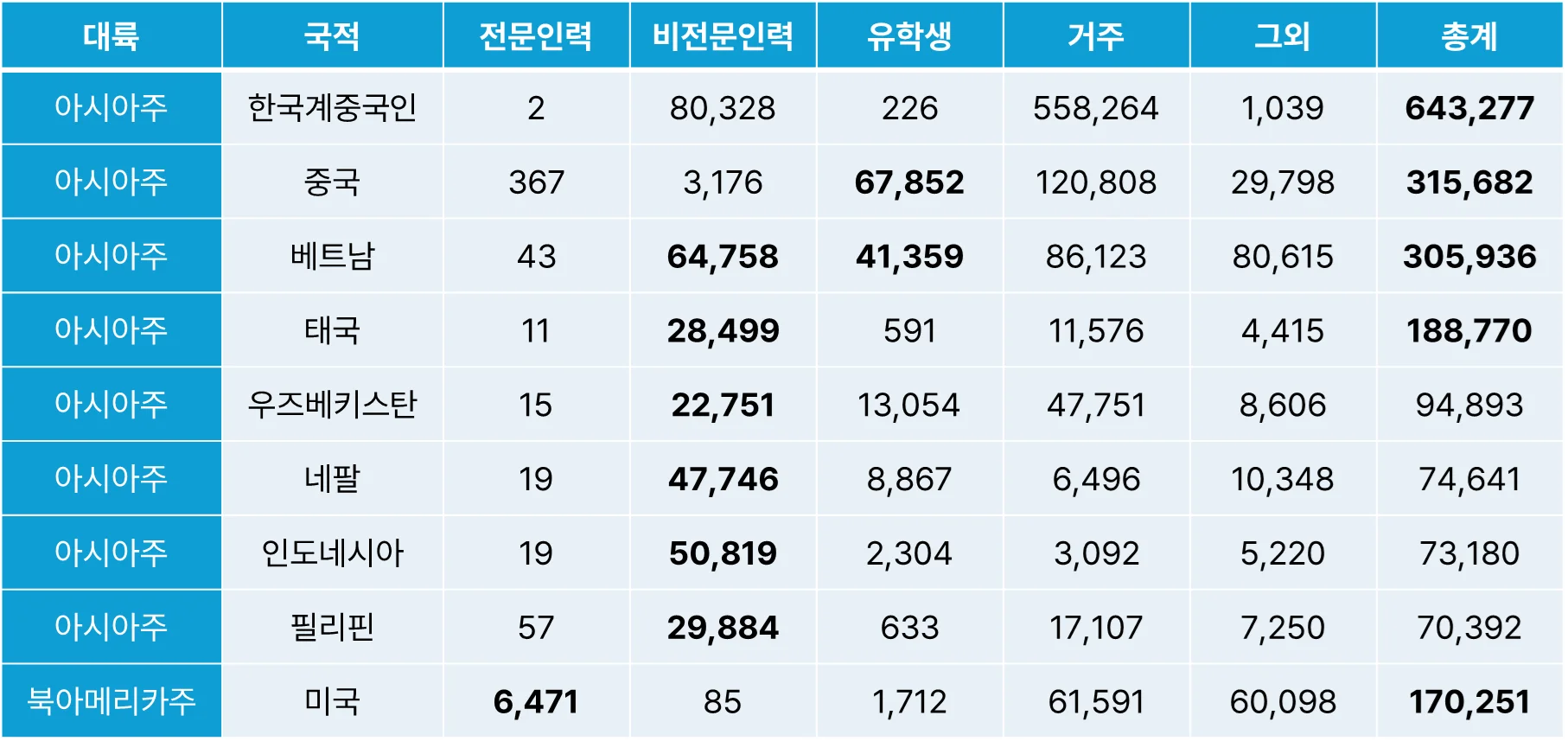 국적별 외국인 구성 또한 다변화되고 있습니다. 2024년 기준으로 총 205개국의 외국인이 대한민국에 체류 중이며, 이 중 중국, 베트남, 태국, 미국 등 일부 국가 출신의 비중이 상대적으로 높은 것으로 확인됩니다. 전체적으로는 아시아권 출신이 절대적으로 많은 것이 특징이며, 비전문인력, 전문인력, 유학생 등의 세그먼트에 따라 국적 분포의 경향도 뚜렷하게 나타납니다. 예를 들어, 비전문인력의 경우 베트남, 태국, 인도네시아, 우즈베키스탄 등 동남아시아 및 중앙아시아권 출신이 중심을 이루는 반면, 전문인력은 미국, 유럽 등 서구권 국적자의 비중이 높습니다. 이러한 구성은 각국의 경제 수준, 비자 제도, 노동 및 유학 관련 정책적 요인과 밀접하게 연결되어 있는 것으로 확인되었습니다.