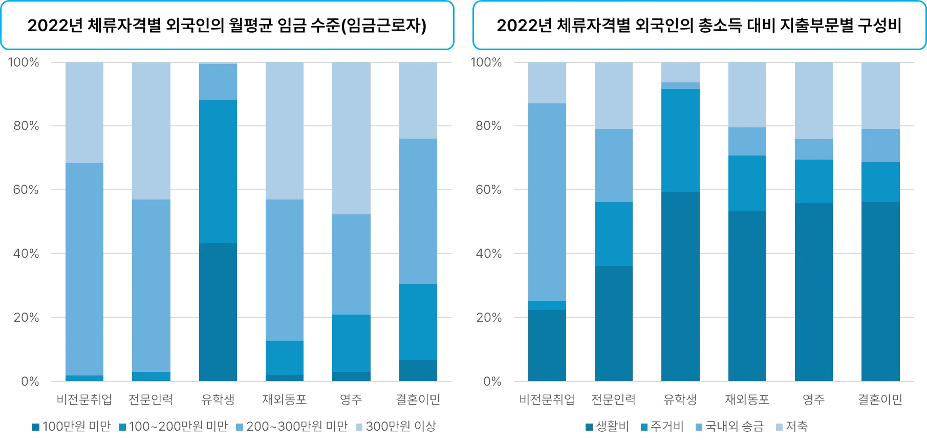 (세그먼트 2) 국내 외국인 전문인력은 2020년 대비 2024년에 약 107% 증가하였습니다. 해당 세그먼트는 한국에서 근무 중인 교수, 회화지도사, 전문기술직 종사자 등으로 구성되어있습니다. 이들 중 가장 큰 비중을 차지하는 국적은 미국이며 이는 외국계 기업의 주재원, 전문직, 대학 교수, 영어 회화 강사 등 다양한 고숙련 직종 분포에 기인한 것으로 분석됩니다. 그렇기 때문에 대부분 중산층 이상의 경제적 수준을 유지하고 있으며, 전체 외국인 중 월 300만 원 이상의 고소득자 비율이 가장 높은 집단에 해당됩니다. 지출 항목은 생활비, 주거비, 국내외 송금, 저축 등으로 고르게 분포되어 있으며, 특히 다른 외국인에 비해 저축 비중이 상대적으로 높다는 점이 특징입니다.
