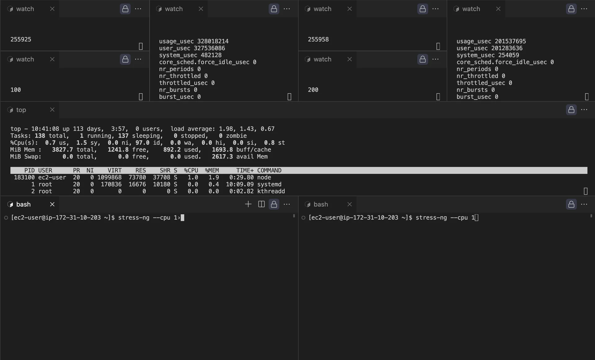 vCPU가 2이기 때문에 스트레스 도구의 인자가 2보다 커져야지 cpu.max로 인한 유의미한 테스트가 가능할 것으로 추정합니다.