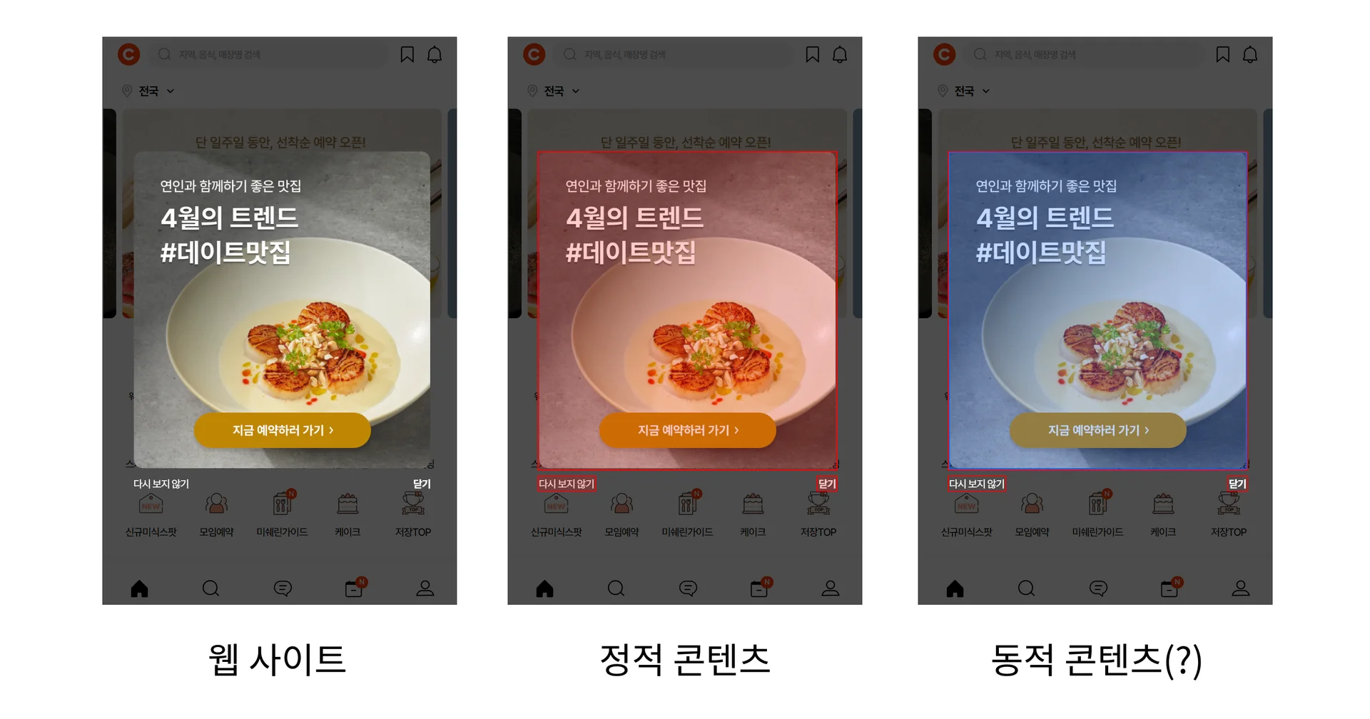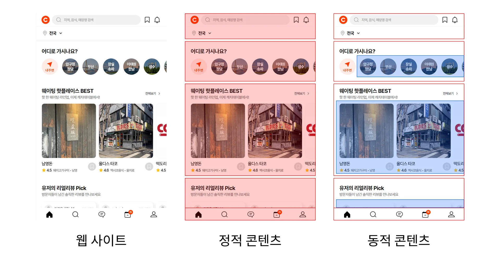 [어디로 가시나요?]의 경우, 하드 코딩 되어 있을 수도 있습니다. 이 경우 정적 콘텐츠에 해당합니다.하지만 캐치 테이블의 콘텐츠 매니저가 수동으로 해당 콘텐츠를 가공하거나, AI 기술로 주기적으로 자동으로 가공하는 경우에는 동적 콘텐츠에 해당합니다.