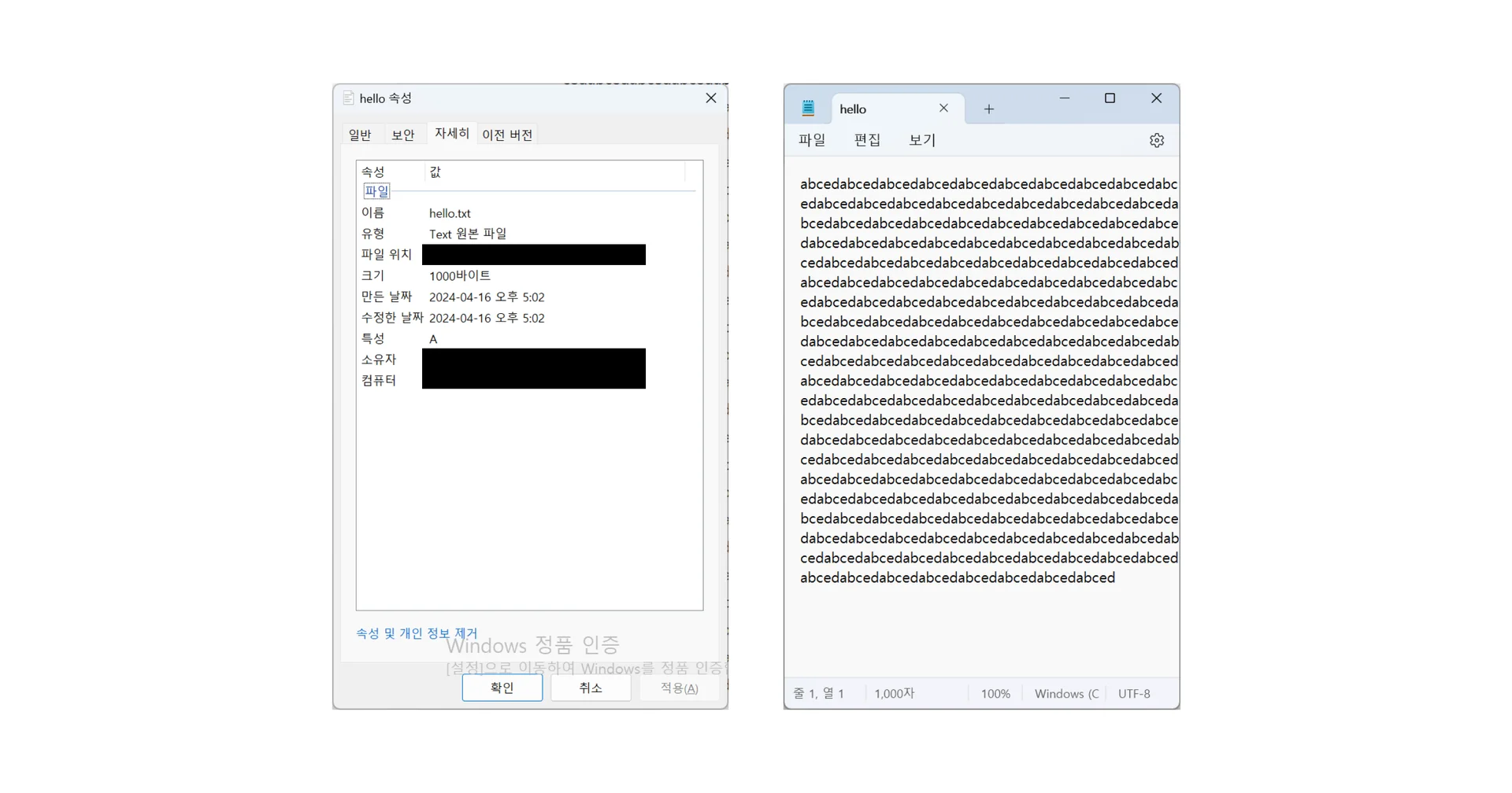 1,000자의 텍스트는 Windows에서 1,000 Byte의 용량을 가지게 되며, 이는 1 KB에 해당합니다.
