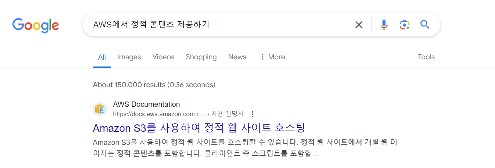 “AWS에서 정적 콘텐츠를 제공하기”라고 검색했을 때, 최상단에 Amazon S3가 노출됩니다.