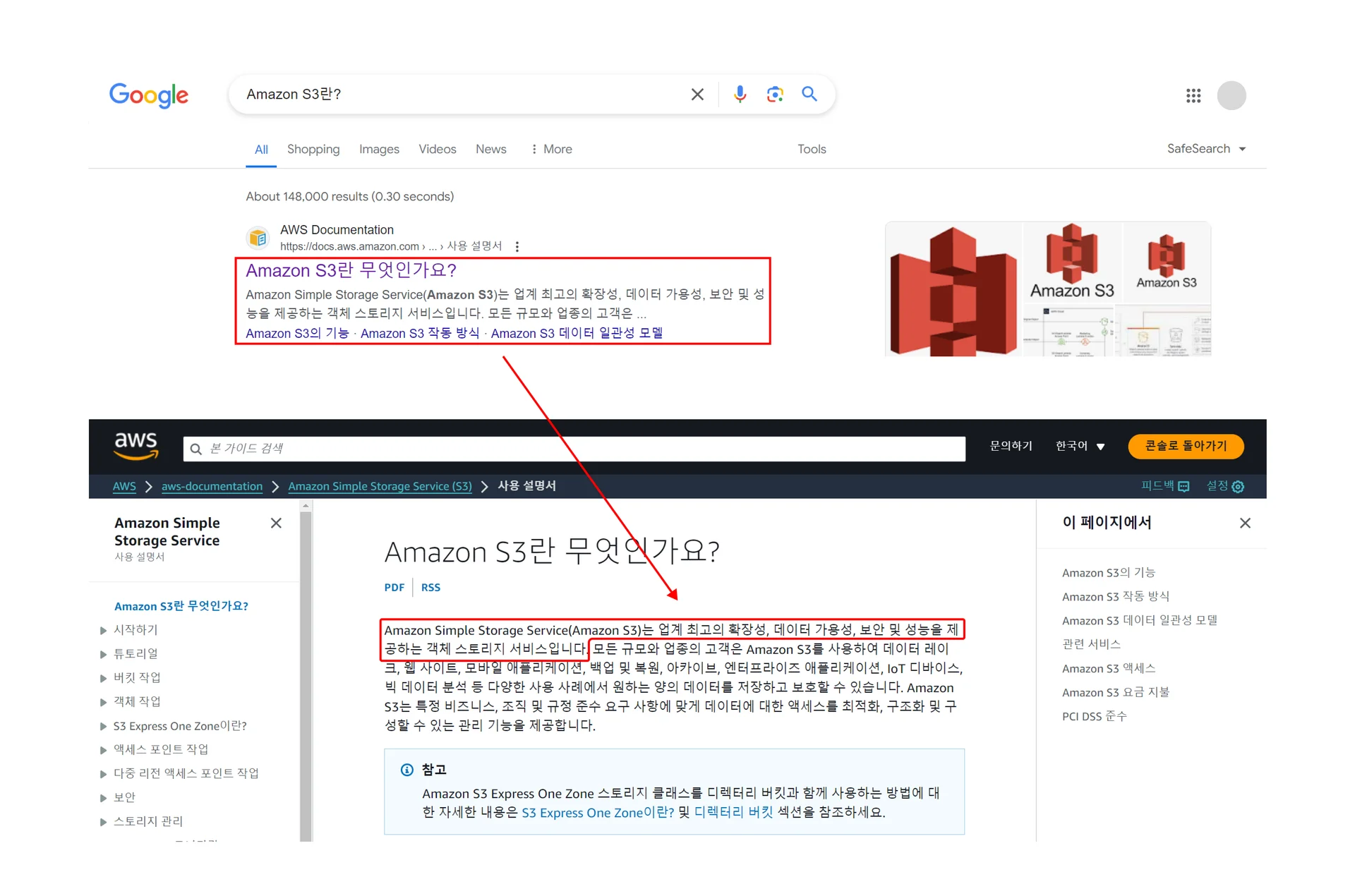하지만 저희는 Amazon S3가 무엇인지 모르기 때문에, Amazon S3라고 검색해보았습니다.