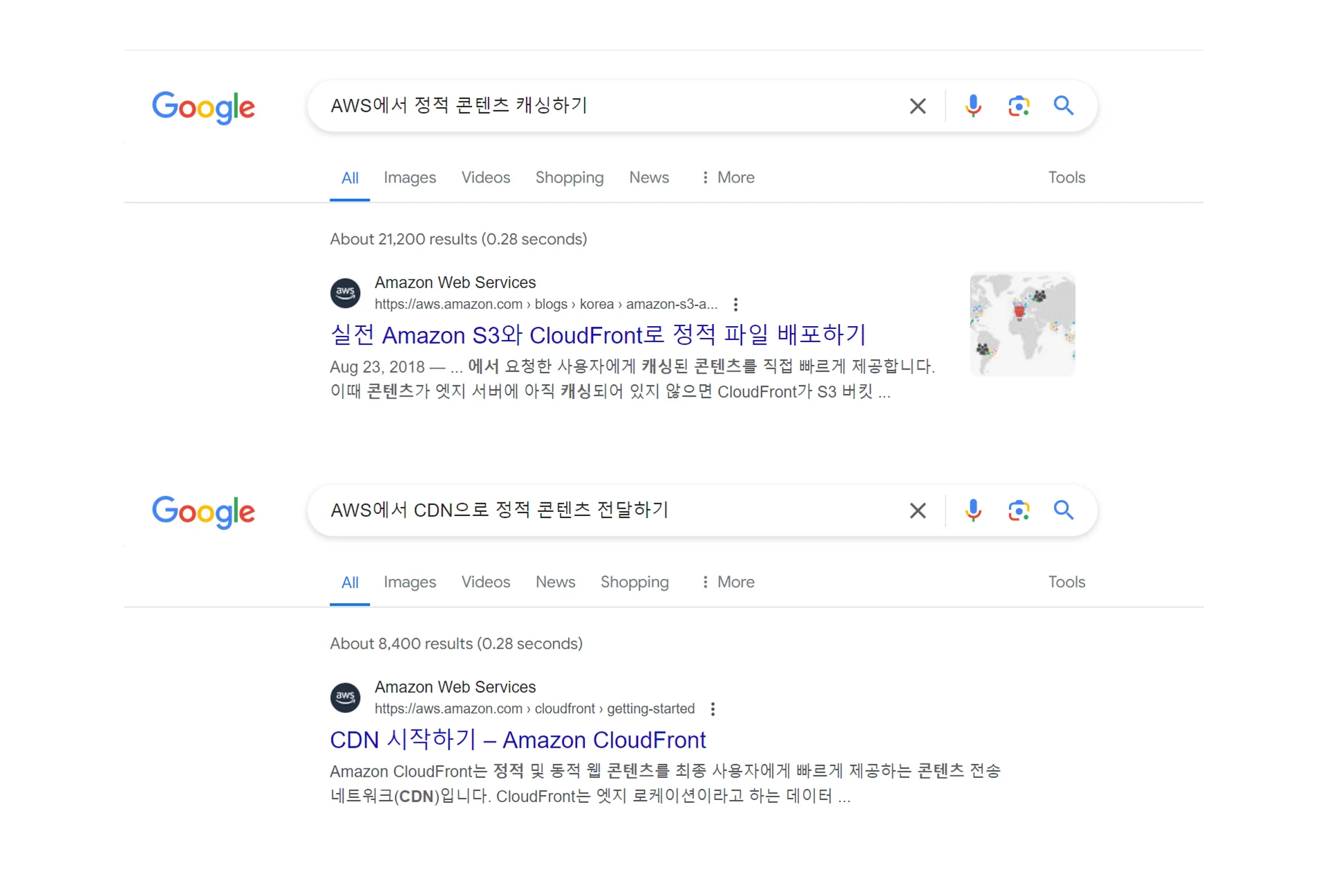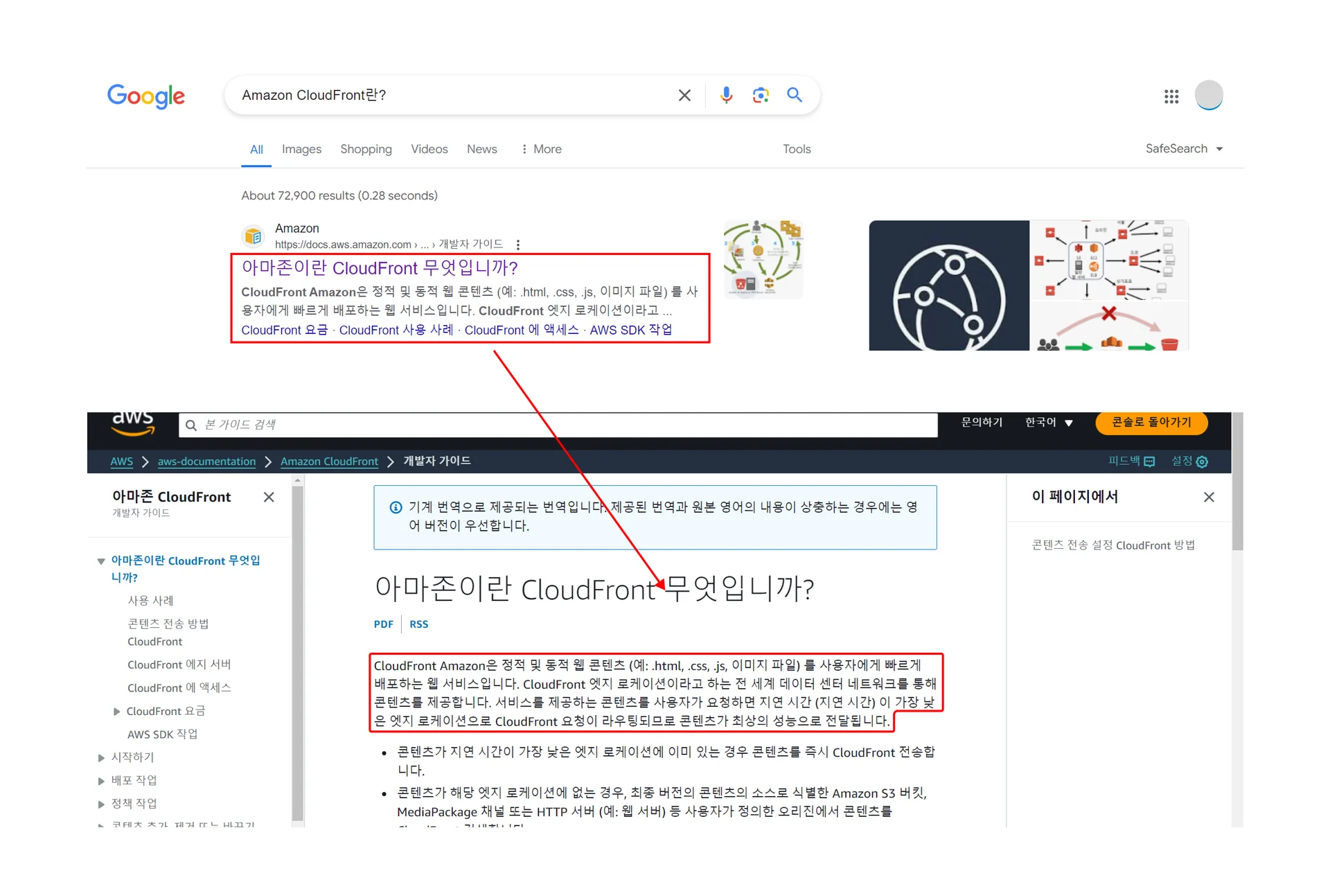 해당 검색어 모두 최상단에 CloudFront가 노출됩니다.