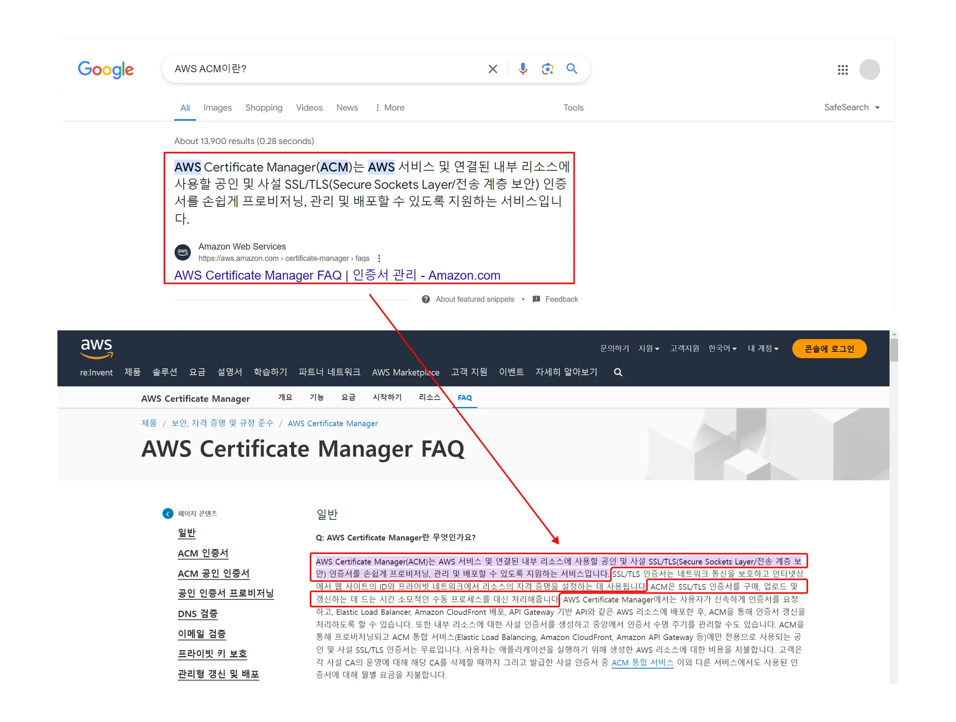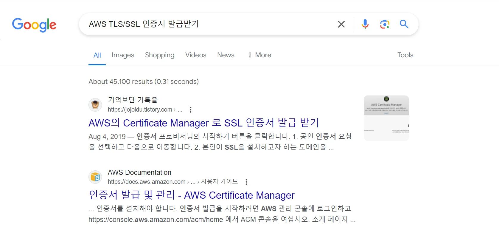 “AWS TLS/SSL 인증서 발급받기”라고 검색하면 2번째에 ACM(AWS Certificate Manager)가 노출됩니다.