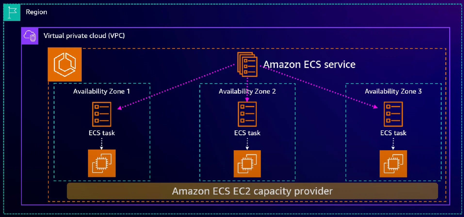 Amazon ECS의 컨테이너 인스턴스가 총 3개의 가용 영역을 선택하였다고 가정합시다.
